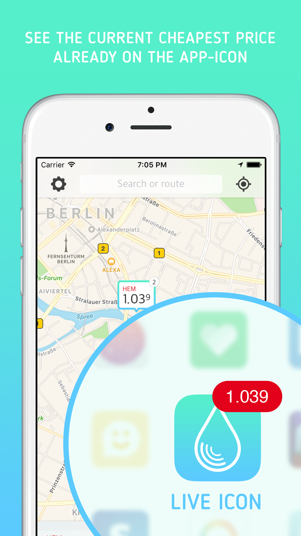 Even before opening the app, the badge function shows you the cheapest price of the fuel you selected within 10km – an easy way to check the currently cheapest gas price.