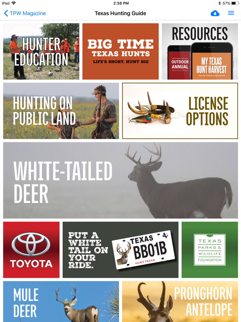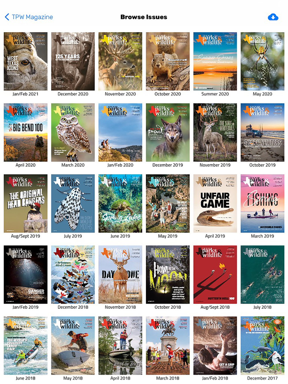 For iPad and iPhone with free bonus materials. Experience Texas Parks & Wildlife, the award-winning guide to the Texas outdoors packed with outstanding photos and articles about fishing, hunting, camping, birding, boating, traveling and more. Texas Parks & Wildlife brings you information about state parks, environmental issues and events taking places across Texas as we fulfill our mission—to manage and conserve the natural and cultural resources of Texas and to provide hunting, fishing and outdoor recreation opportunities for the use and enjoyment of present and future generations.