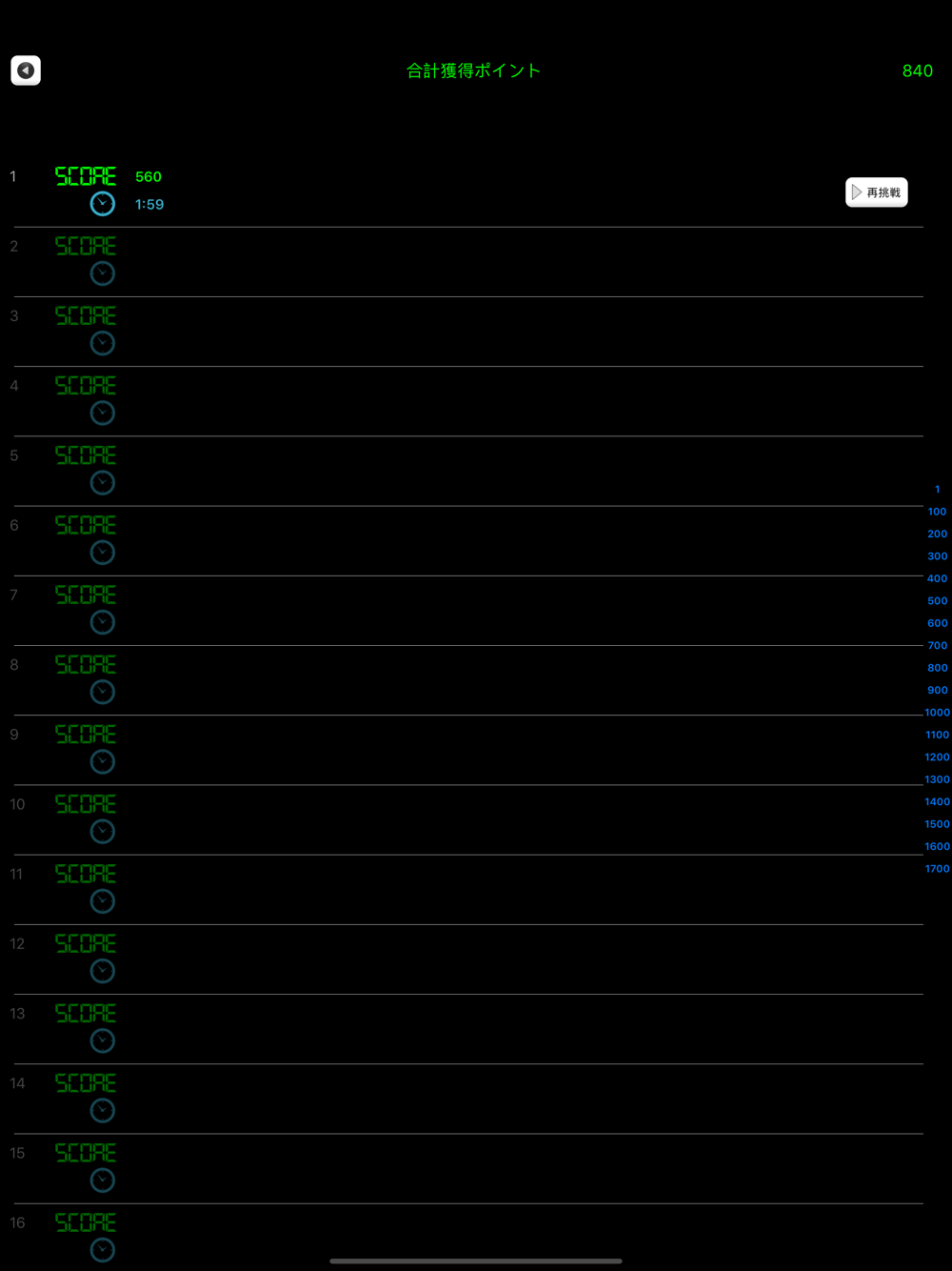 ・難易度は徐々にアップします。1問ずつ解答しなければ次の問題にはすすめません。また、得点が0点以下の場合はやり直しになります。