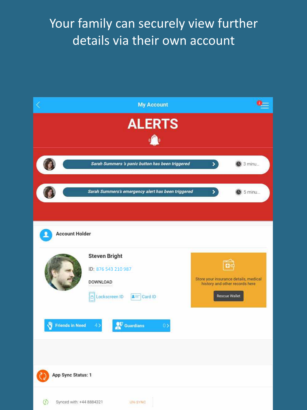 In addition to triggering and sending emergency alerts, the app is also fully integrated with our web-based platform. This will enable your selected family members to securely access and share your custom pre-set “Rescue Wallet” from anywhere in the world to facilitate your rescue in your time of need: