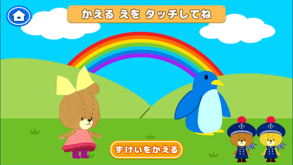 色の塗られていない動物や乗り物をタッチすると色がつきます。