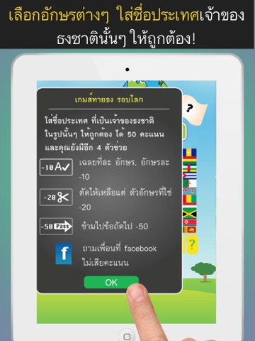 เลือกอักษรต่างๆ ใส่ชื่อประเทศเจ้าของธงชาตินั้นๆให้ถูกต้อง ในแต่ละเลเวล จากง่ายไปยาก โดย เกมได้รวบรวมธงชาติ จากทุกประเทศต่างๆบนโลก มากให้คุณทดสอบความรู้รอบตัวของคุณ โดยต้องใส่ชื่อเจ้าของธงชาติในรูปนั้นๆ ให้ถูกต้อง ได้ 50 คะแนน และคุณยังมีอีก 4 ตัวช่วย