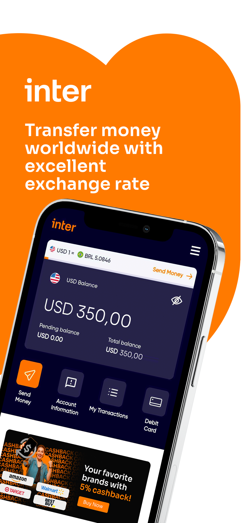 One single app for you to manage your entire global financial life. Open your Inter Global Account free of charges in minutes. Send money to +60 countries, load funds and manage your dollar balance, make free transfers to other Inter Global Accounts, pay bills in the United States, and load credits to Brazilian and Mexican prepaid mobile phones. Find more than 700 options of gift cards to purchase, use, and send to others as you wish. Shop with cashback in over 120 stores and brands. Receive an international debit card to purchases and withdraw money in local currency. Take control of your global financial life and live like a local anywhere.