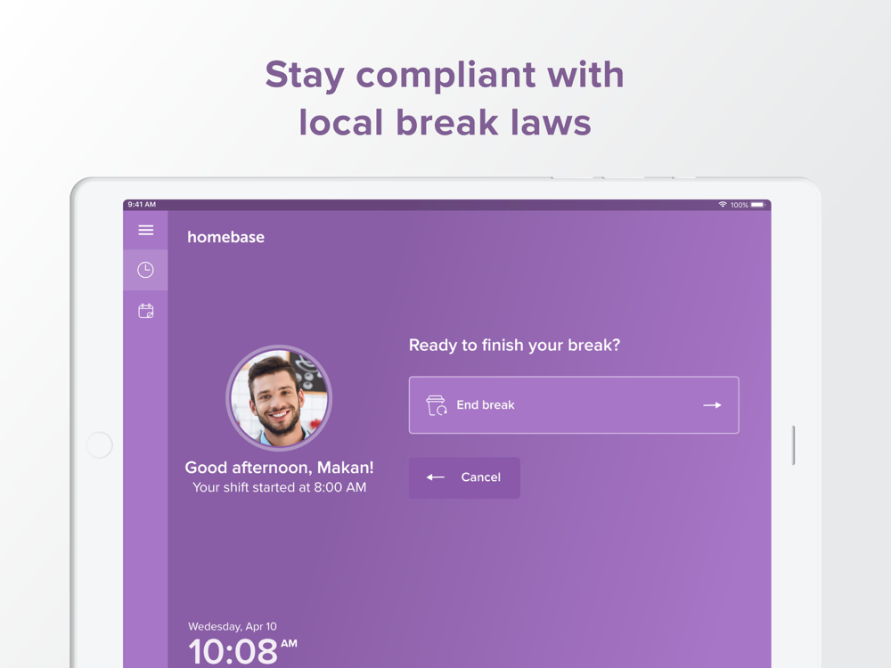 The Homebase time clock app for iPad works seamlessly with all of our time clock apps using a secure PIN. So your employees can clock in on your iPad and clock out from their smartphone, computer, or your point of sale terminal. Plus there’s a built-in offline mode, so you’ll never miss a clock out—even with unreliable Wi-Fi.