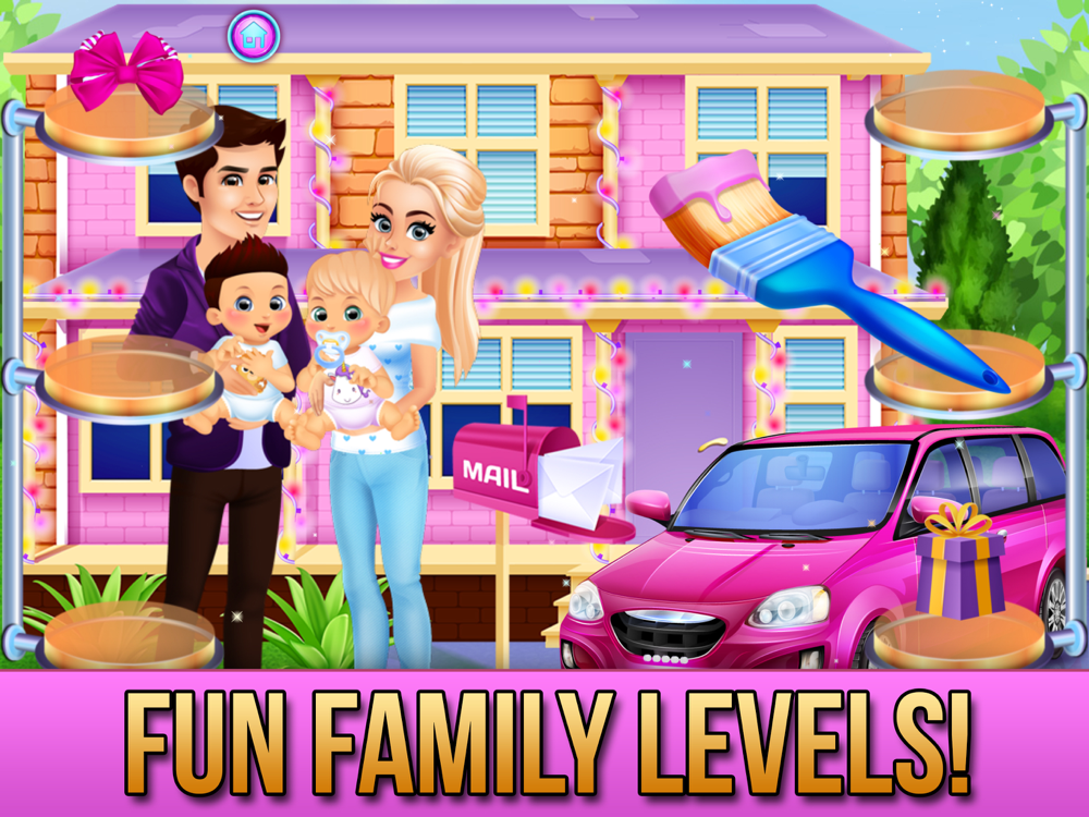 Level 14: Super fun baby play room! Let's play in the bouncer! Add sparkles, decorate & more with mommy, daddy and babies!! Hooray!
