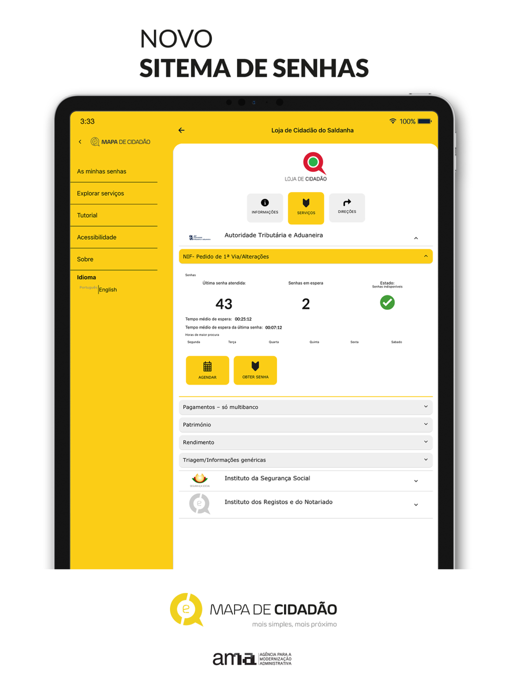 Permite verificar nas Lojas do Cidadão e para os serviços disponíveis nos balcões de atendimento das diversas entidades quantas pessoas estão em espera e qual a senha que está a ser atendida. É ainda possível de acordo com as informações disponíveis a indicação do melhor percurso numa loja para a realização dos serviços pretendidos.