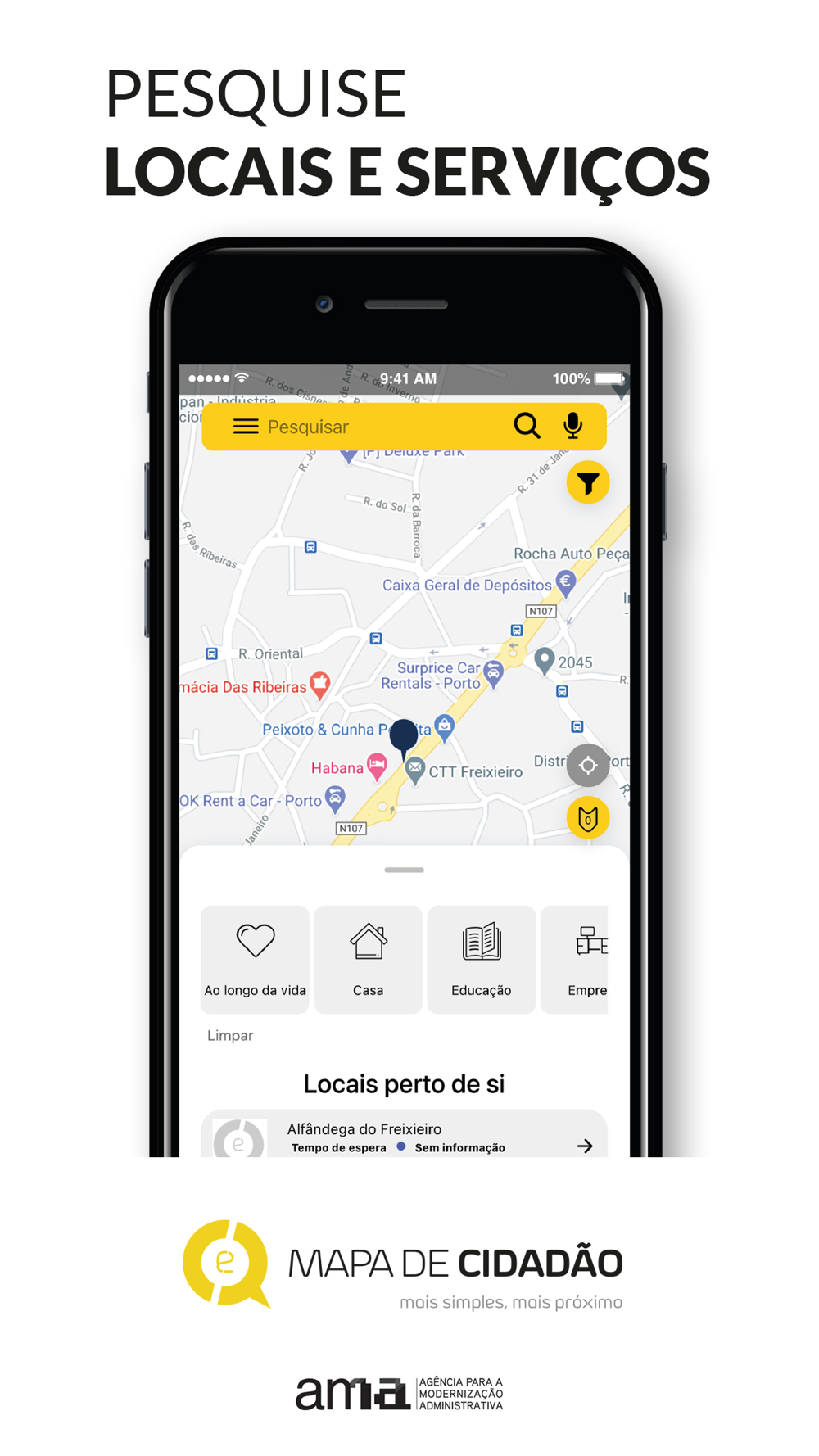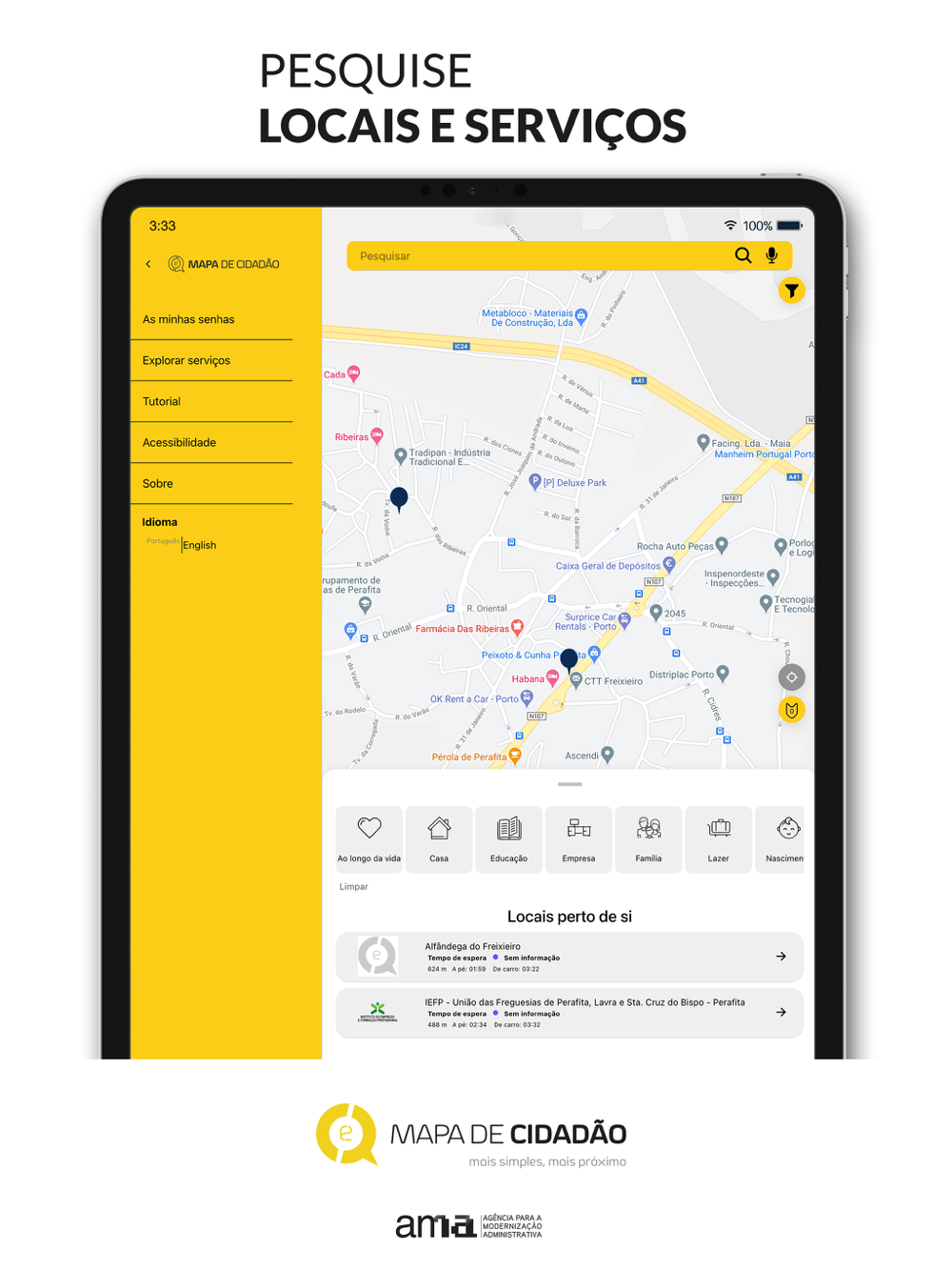 O Mapa de Cidadão reúne num só ponto os locais de atendimento, permite encontrar os serviços públicos mais próximos e obter senhas online sempre que estejam disponíveis.