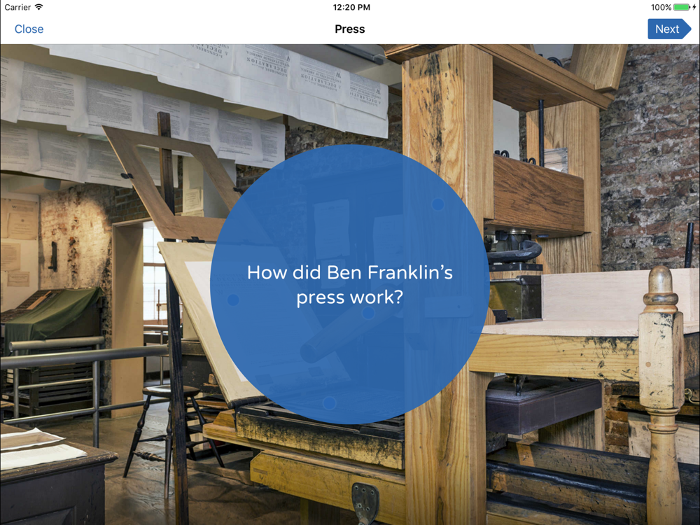Print on Benjamin Franklin's press - Drag the letters in your name on to the composing stick and then use your finger to coat them with ink. When you're ready, pull the lever to earn your Printer's badge.