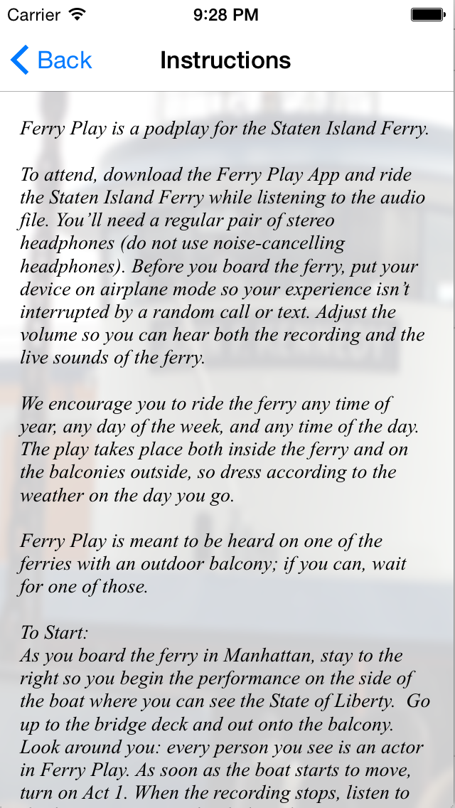 Ferry Play is a self-scheduled performance: you can ride the ferry late at night, early in the morning, or any time in between - you choose the day and time, which then affects the experience you have. Act 1 takes place on the ride from Manhattan to Staten Island; Act 2 takes place on the ride from Staten Island to Manhattan. Podplays are an emerging genre of theatre that take advantage of mobile technology to create site-specific audio-based theatrical experiences.