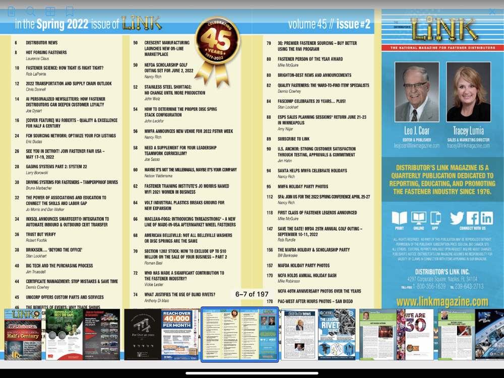 LINK Magazine has been servicing the fastener manufacturer and distributor with timely news articles on company expansions, moves, new products and materials. LINK's editorial content is directed to the fastener distributor. We feature stories which provide pertinent technical information as well as legislative updates, trade shows, convention coverage, association meetings, and special events in the fastener industry.