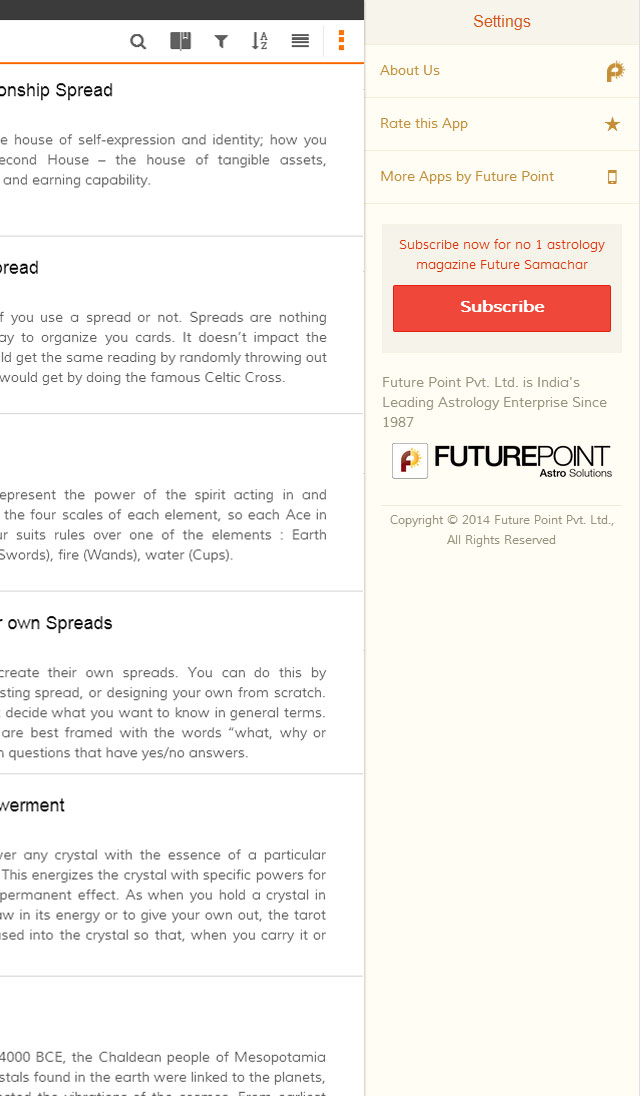 Tarot app articles describe the method of Tarot consultations which offer guidance, clarity, and the opportunity to use the symbolic language of Tarot to go deeper to find wisdom and insight. Tarot can answer questions for all types of issues, such as relationship compatibility, spiritual growth, career choices, life choices, family, school and education, where to live, health, and other topics.