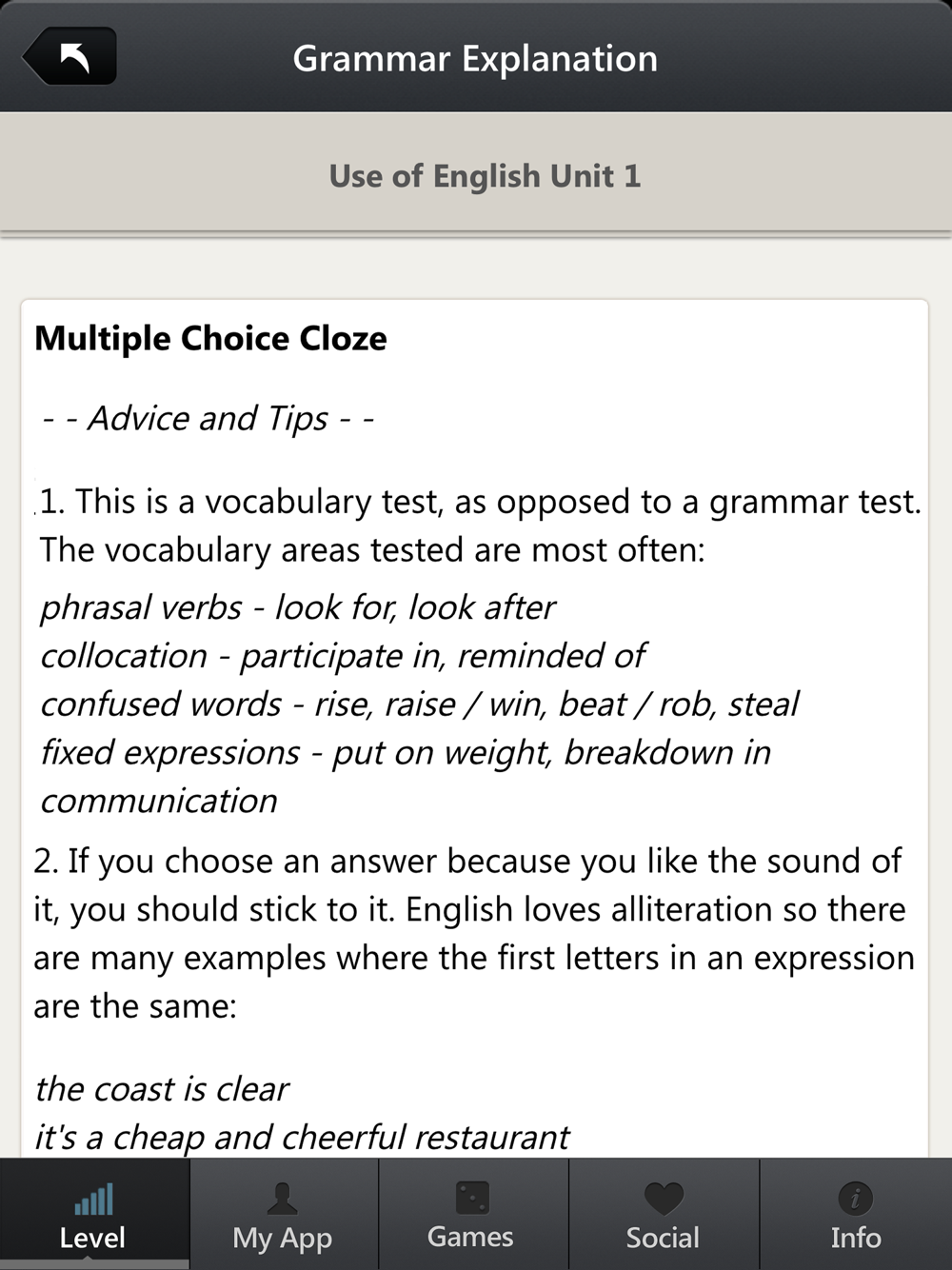In the Exams app, you can work on Use of English and Reading, and also get vital practice in Listening and grammar. There are also tips and a lot of advice about doing each part of the three examinations. With this new version, you will also get great practice for Writing and Speaking!