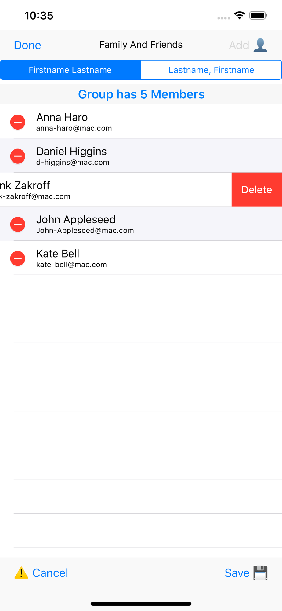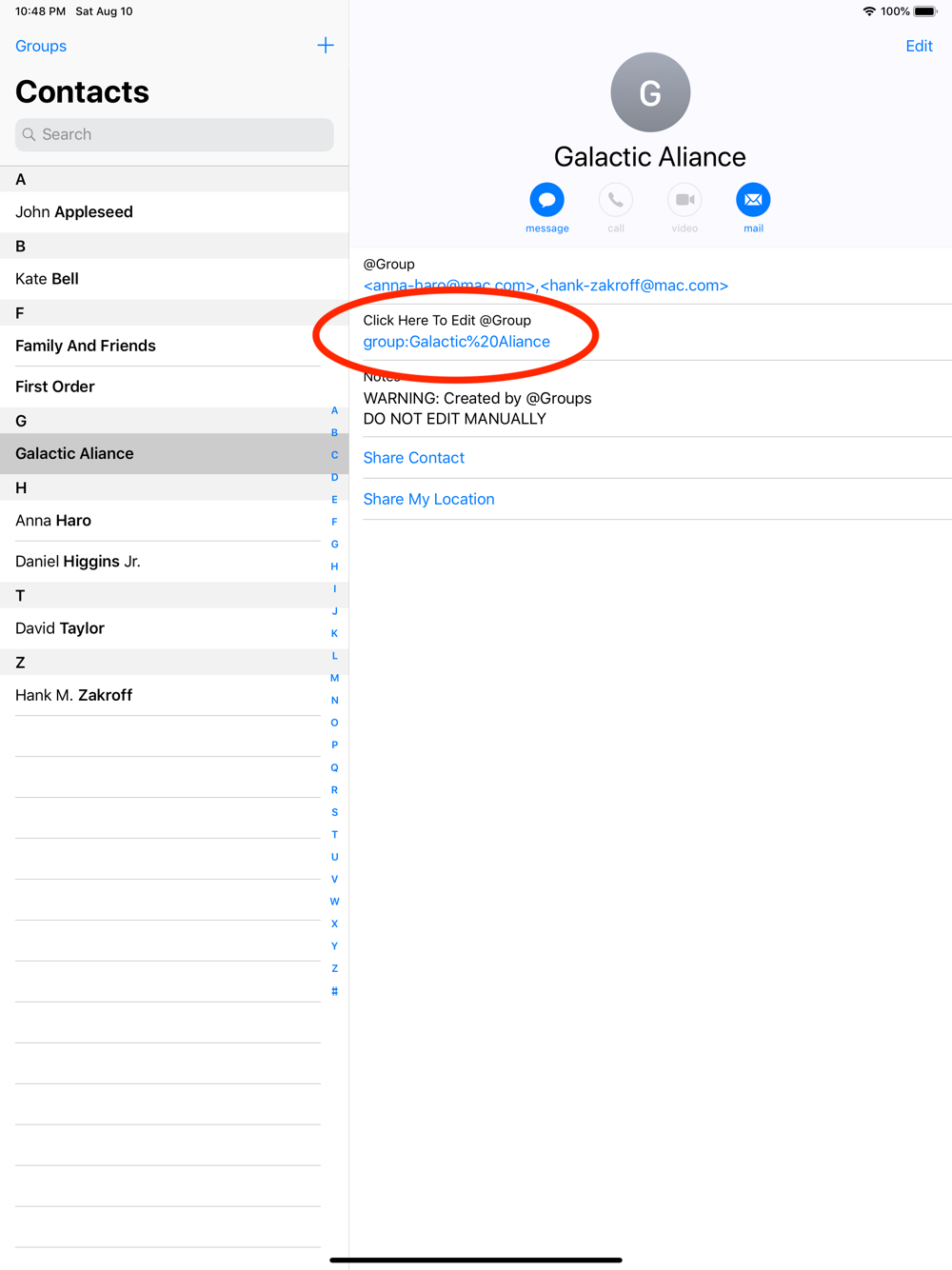 @Groups is a very simple application that enables you to build and edit standard contacts Groups. This contact group can then be added to an email and it will automatically include the email address of each contact in the group.