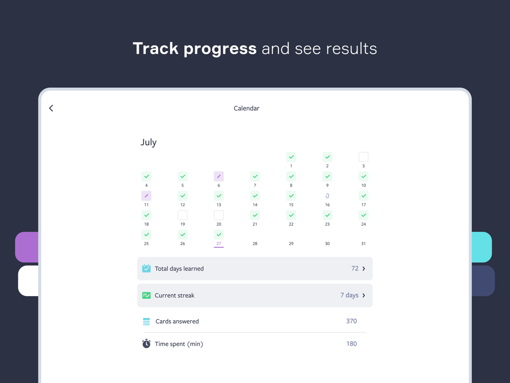 Using scientifically proven spaced repetition methodology, the vocabulary gets fixed in your long-term memory over time.