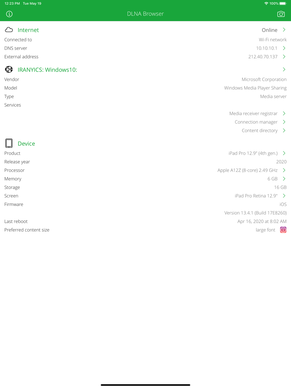 • Show DLNA host IP address, port number, UPnP version, local name, domain name, MAC address (with vendor information), PING capability.