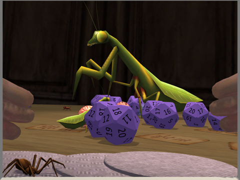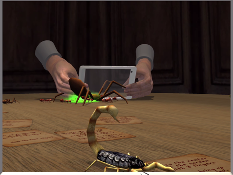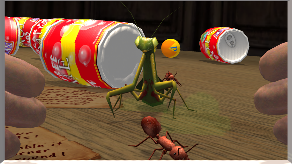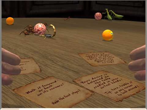 The launch scene is Bug Farm. Your device is balanced on a tabletop that's teeming with bugs! Fire Ants, Spiders, Scorpions and Praying Mantises come after you across the table in immersive 3D. They're aggressive but harmless. You can knock them back with balls by tapping the screen, and walk or skate away, but unless you distract them with a Bait Ball, push or knock them off the table – they'll keep coming. If they get close enough, you can even squish them under your iPad or iPhone!