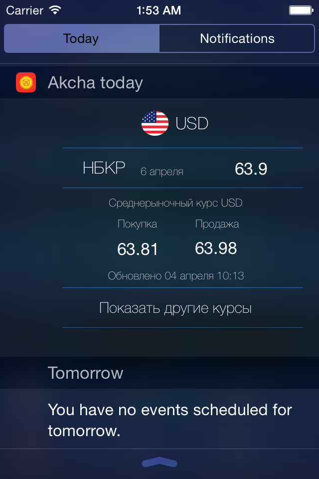 - Виджет текущего курса основной валюты всегда на экране в области Центра Уведомлений