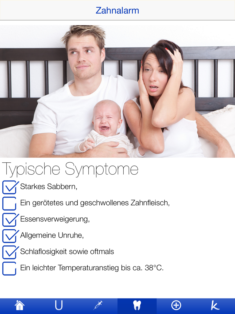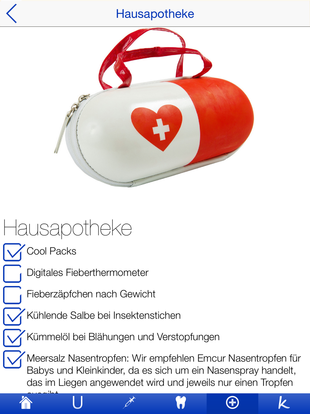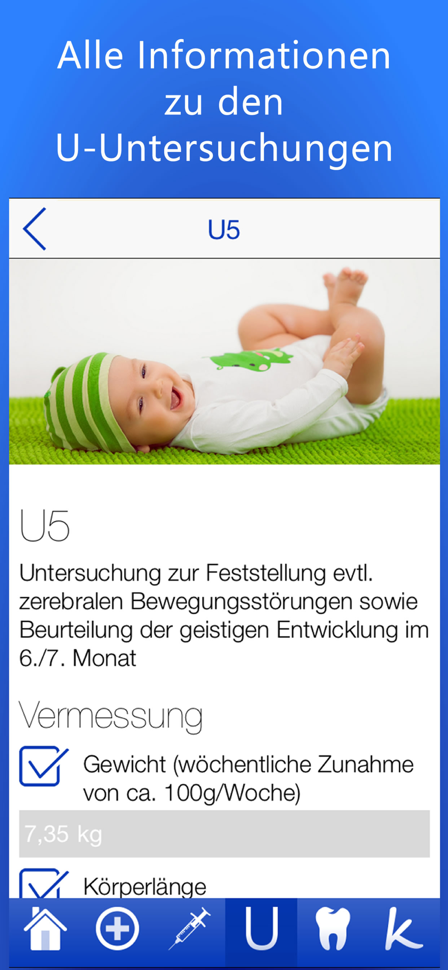 Mit dieser App bekommst du sämtliche Checklisten zum Thema „Baby Gesundheit“ in einer einzigen App: Durch die U-Übersicht (U1-U6) bist du in Punkto Termine, Untersuchungsablauf und Meilensteine (vgl. „Oje, ich wachse!“) immer rechtzeitig informiert und behältst den Überblick über Knöpfchens Entwicklung. Die weiteren Checklisten (Impfpläne, Krankheiten, Zahnen, Zahnpflege, Hausapotheke, Arztnotfall, Krankenhausnotfall, Vergiftungsnotfall) helfen dir und deinem kleinen Knopf bei seinem Start ins Leben und unterstützen euch bei ersten Schwierigkeiten. Wieso sind Masern so gefährlich? Wo kommt der nächste Zahn? Wann solltest du mit deinem Baby besser ins Krankenhaus fahren? Bei all dem hilft dir unsere App weiter, so dass ihr das erste gemeinsame Jahr möglichst unbedarft genießen könnt.