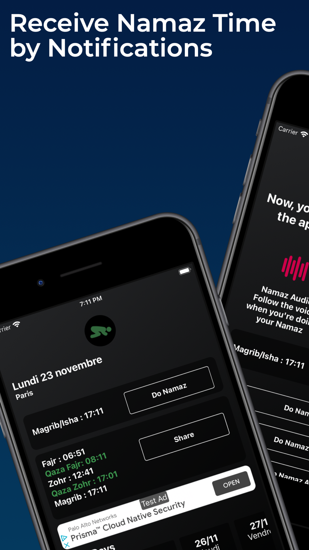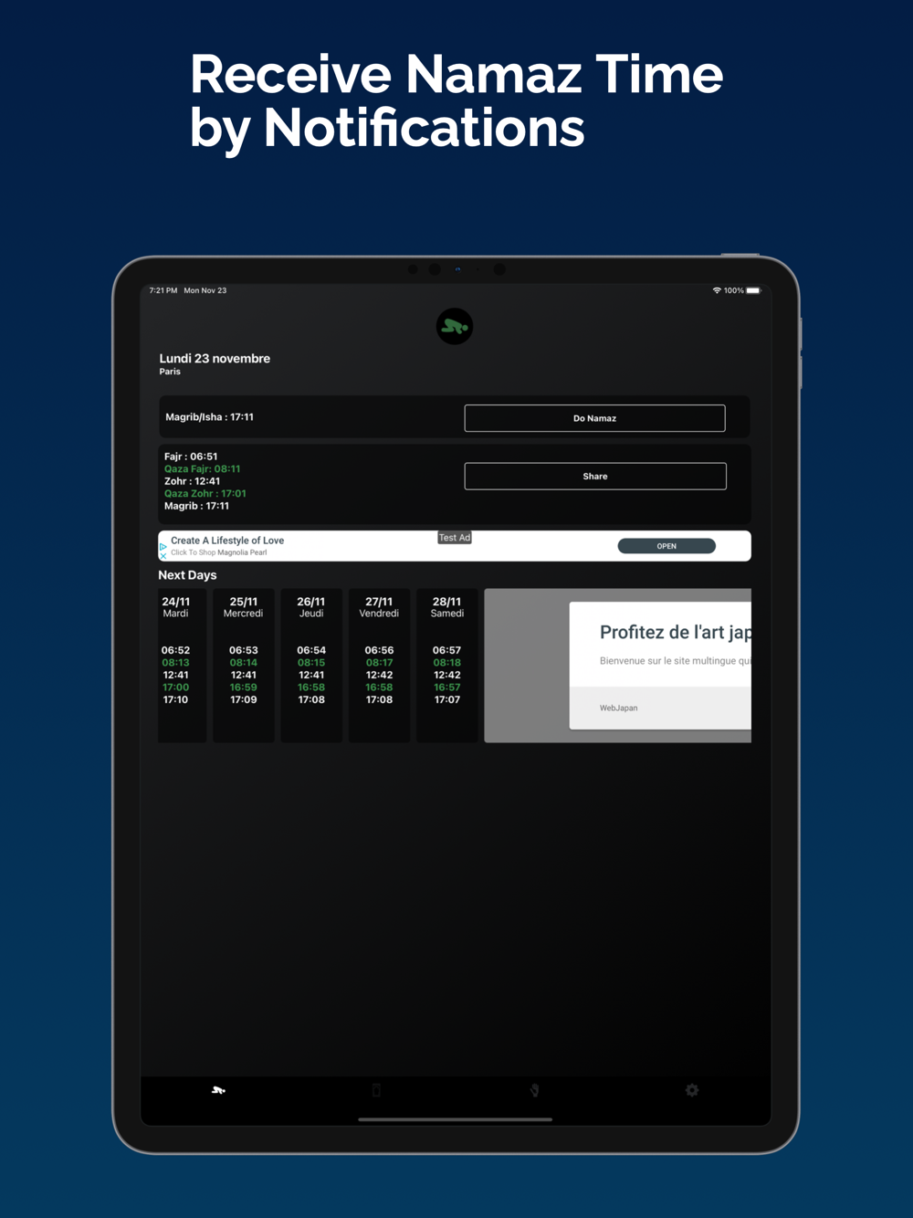 Receive the hours of Namaz: Fair, Sunrise, Zohr, Sunset and Magrib.