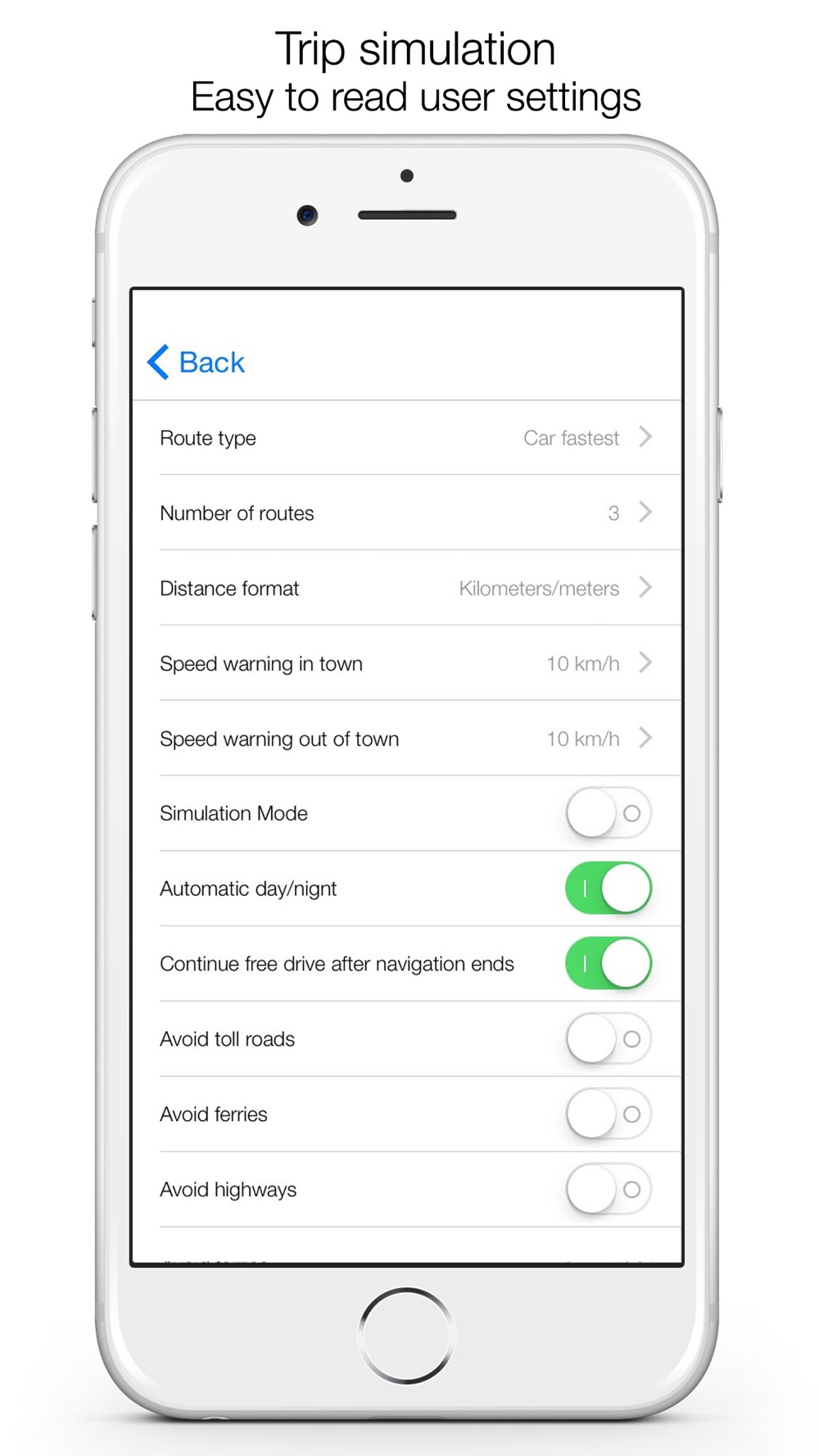 • Route simulation mode to preview your trip
