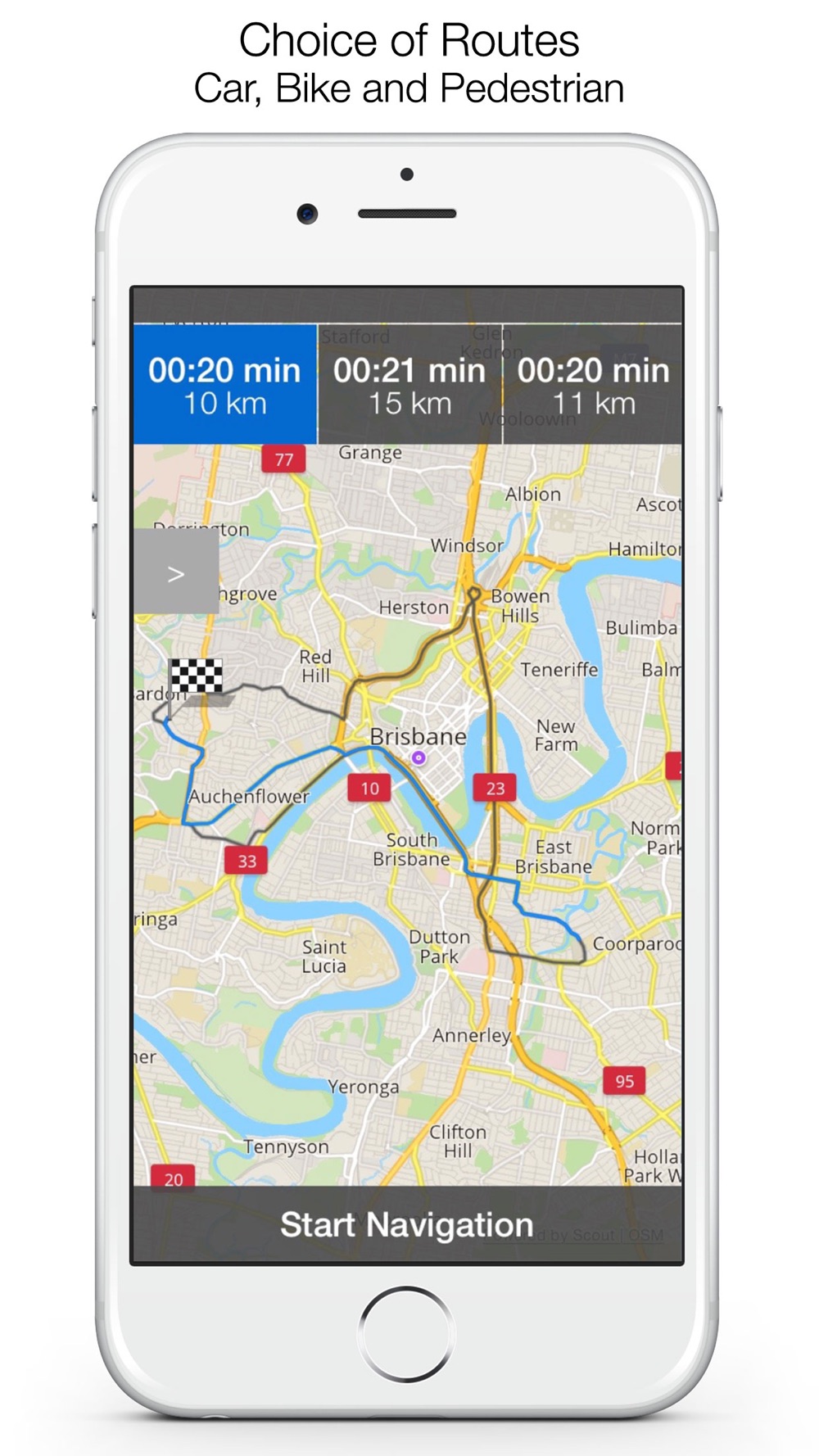 • Selectable Route Types - Car efficient, fastest, shortest, Pedestrian (options map turns to north facing or direction), Bike fastest, shortest and quietest