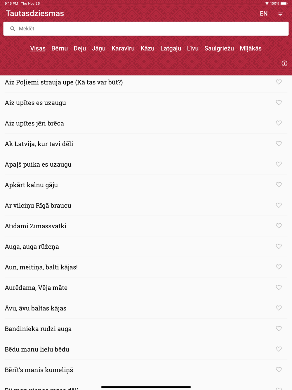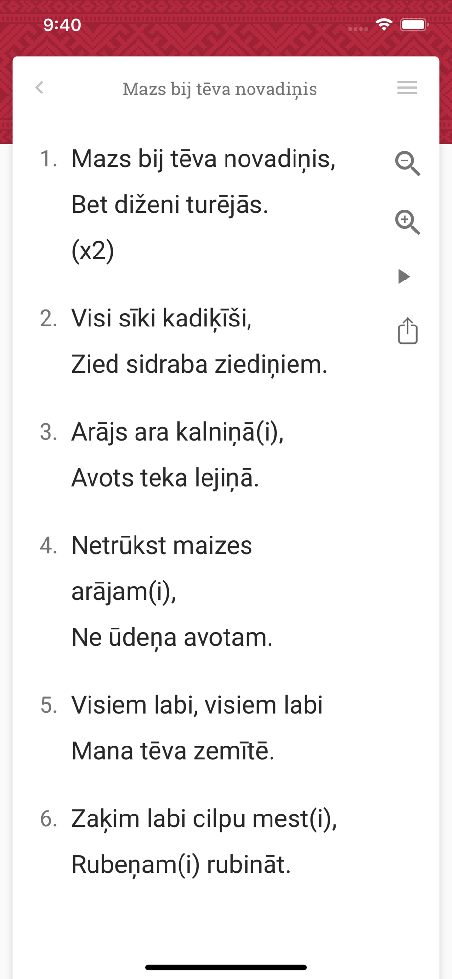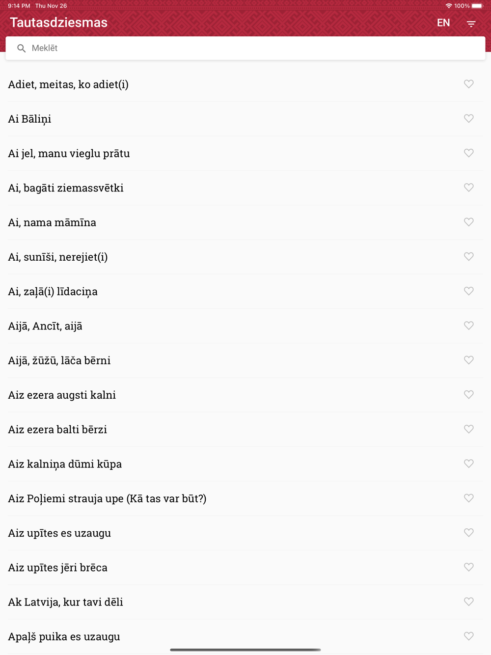 Tautasdziesmas was first launched in November, 2018 to commemorate Latvia’s centenary celebrations and included the 100 most loved Latvian folksongs. The app contains folksong music and lyrics as well as renditions of these songs. It also works without an internet connection, eg. singing Midsummer songs around the Jāņi bonfire, or on top of a mountain skiing!