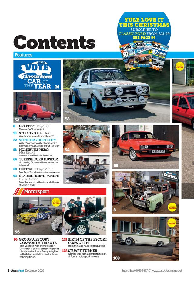 Classic Ford is the heart and soul of the global classic Ford scene. Whether standard or modified, if it’s a retro Ford it’s here — from the Popular and Anglia, through to the Cortina, Capri, Escort and Granada, to the Fiesta and Cosworth Sierra. Written in an authoritative but entertaining style, and with a heavy emphasis on top-quality photography, each issue is packed full of stunning feature cars, along with the latest news from the worldwide classic Ford scene — shows, events, club runs, and historic racing and rallying, plus much more. It can be tough to find a regular source of information on Fords that will allow you to complete your projects, but look no further, because Classic Ford gives you regular in-depth tuning and restoration articles, practical hands-on features, product news and tests, full buying guides and a strong readers’ classified section. A subscription to Classic Ford makes perfect sense! Why not treat yourself or somebody else to a year’s worth of the UK’s best selling Ford magazine!