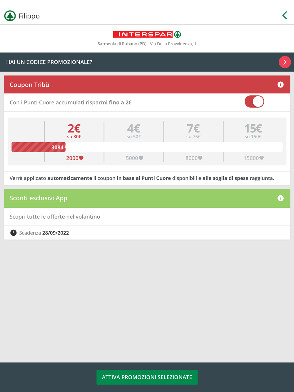 Quando hai raccolto abbastanza Punti Cuore vai alla sezione ‘Attiva le Promozioni’ e scegli quale coupon attivare: