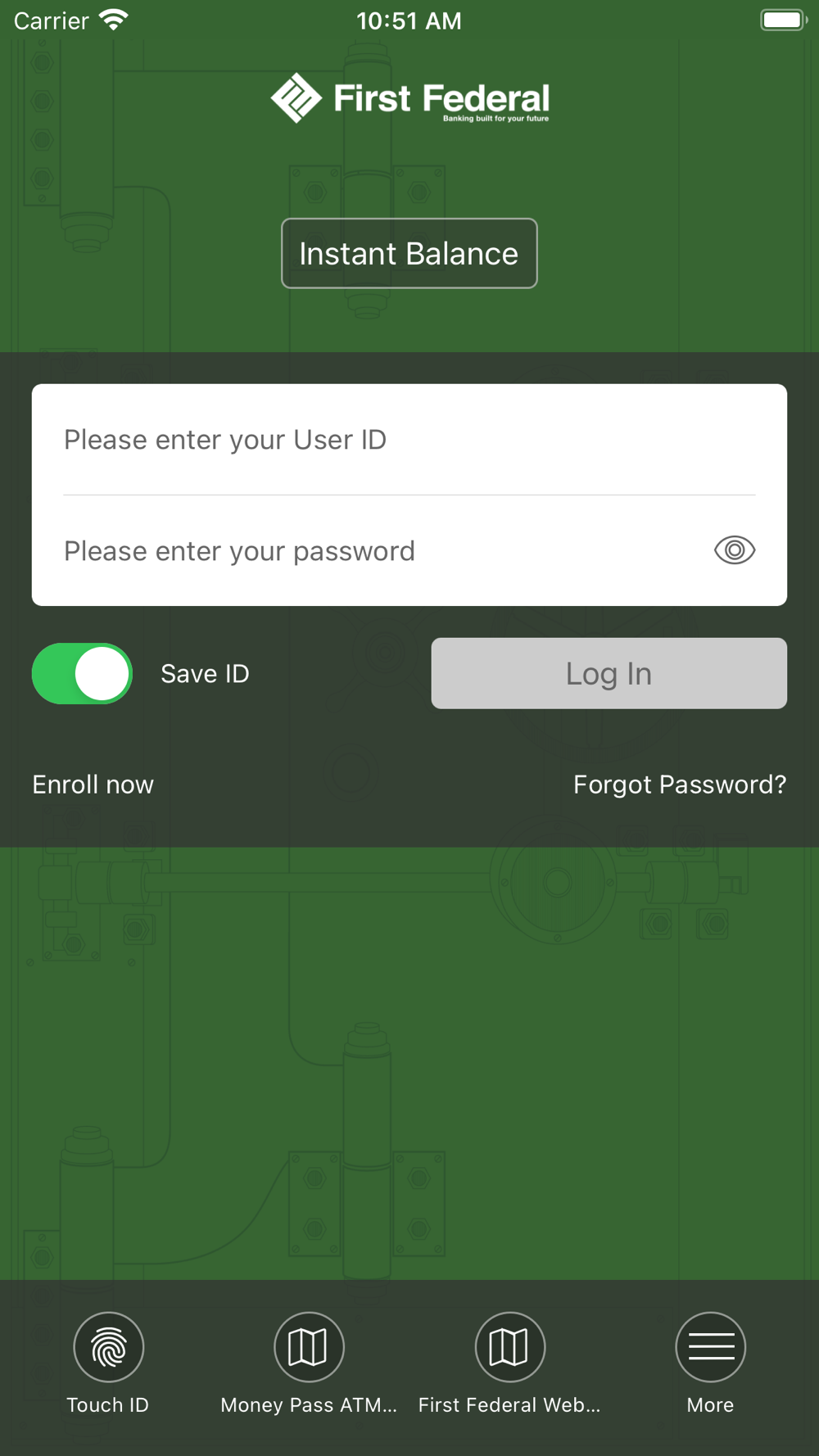 Your money is at your fingertips, whether at home, at work, or on the go - with First Federal Mobile Banking. Our banking app puts the highest priority on security and usability. It's ready to fit seamlessly into your life and into your hands. Manage your money anytime, anywhere with Mobile Banking Instant Balance: When enabled, users can securely preview balances without logging in. Touch/Fingerprint ID: Log in using your fingerprint instead of a password with Apple's Touch ID. Account Balances: View your account balances in real-time. Recent Transactions: View both recent and pending transactions. Check Images: View images of the front and back of your checks. Transfer Funds: Easily move money between your accounts. External Transfers: Transfer money with other financial institutions. Add Contacts: Add companies and people to send money to. Send Money: Schedule payments to companies and people. Request Money: Request money from other people. Receive Money: Accept payments from other people. Deposit Checks: Deposit paper checks using your phone's built-in camera. Credit Score: When enabled, simply log in to check your current credit score. Getting started is easy. Simply download the app and sign on with your Online Banking user credentials. No additional fees apply.*. For more information about First Federal mobile services, please visit www.FirstFedWeb.com or call us at 888-317-8333. *Carriers data rates may apply.