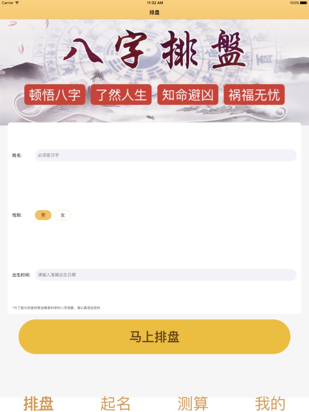 【专业排盘】输入生辰八字,免费为您专业排盘,揭晓四柱八字、十神解析、喜用神和用神建议;