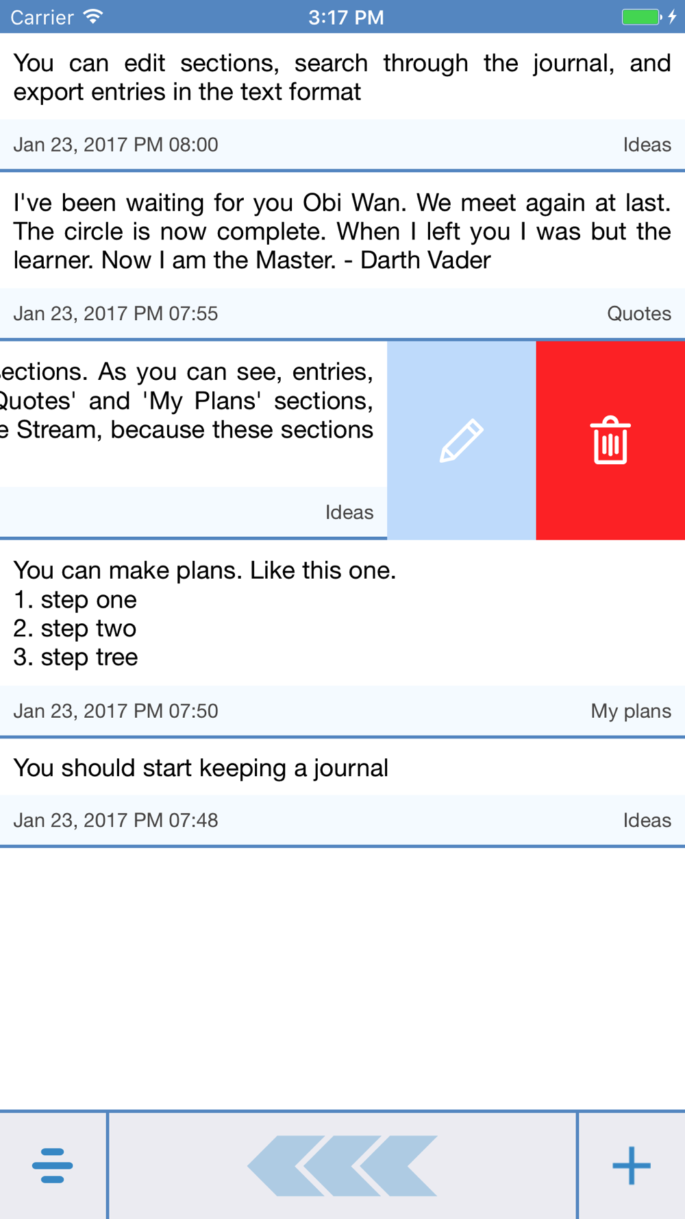 The main function of this app is to let you capture the events and experiences of your life, record unique thoughts and ideas, set goals for the future and solve tricky problems. This journal is all about simplicity. It has no bells and whistles in it, only the necessary functionality. It has two main parts to it. One is the ‘Stream’ of your entries. Another is ‘Sections’.
