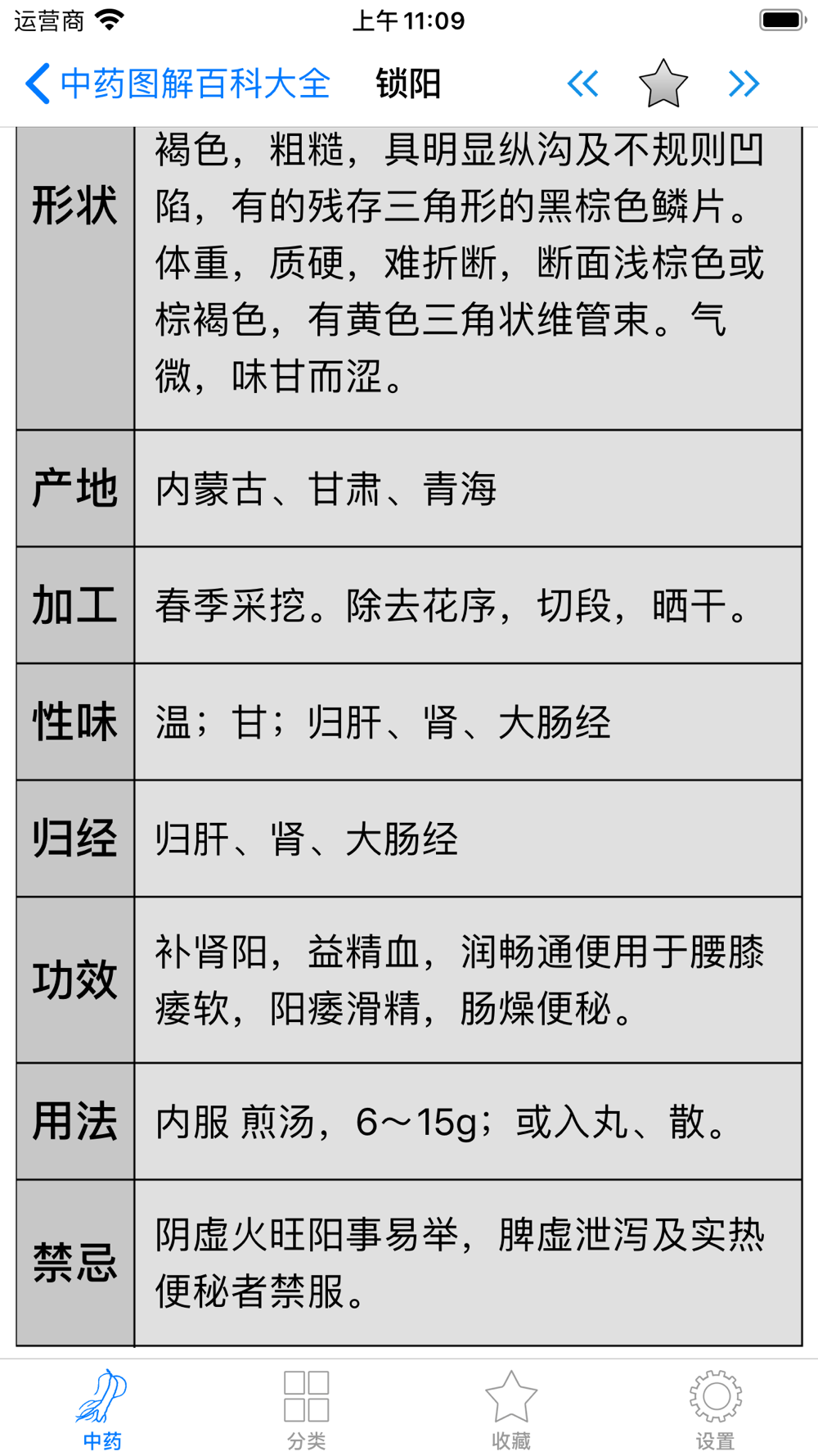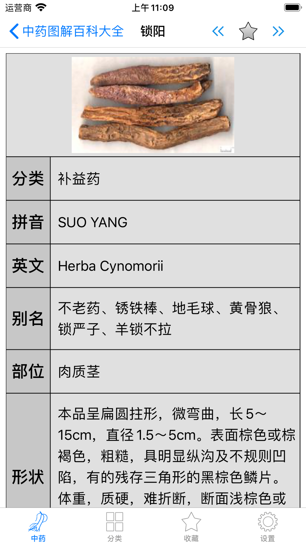 每种中草药都配有图片,功效,性味,用法,使用禁忌,归经,产地,制作方法,采集部位,出处,形状,别名,英文名,拼音,分类等信息。