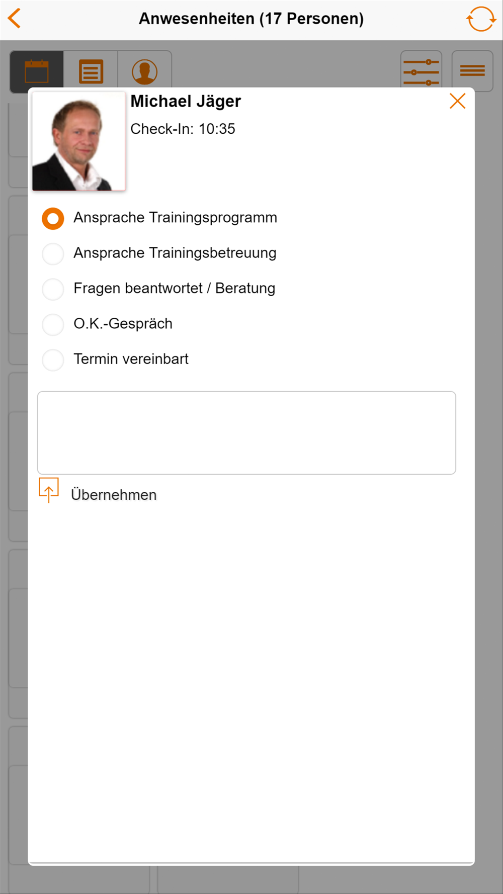 Hierbei sieht der Mitarbeiter alle betreuungsrelevanten Daten - des trainierenden Mitglieds - direkt auf seinem mobilen Endgerät. Die Grundlagen einer professionellen Betreuung sind somit gegeben.