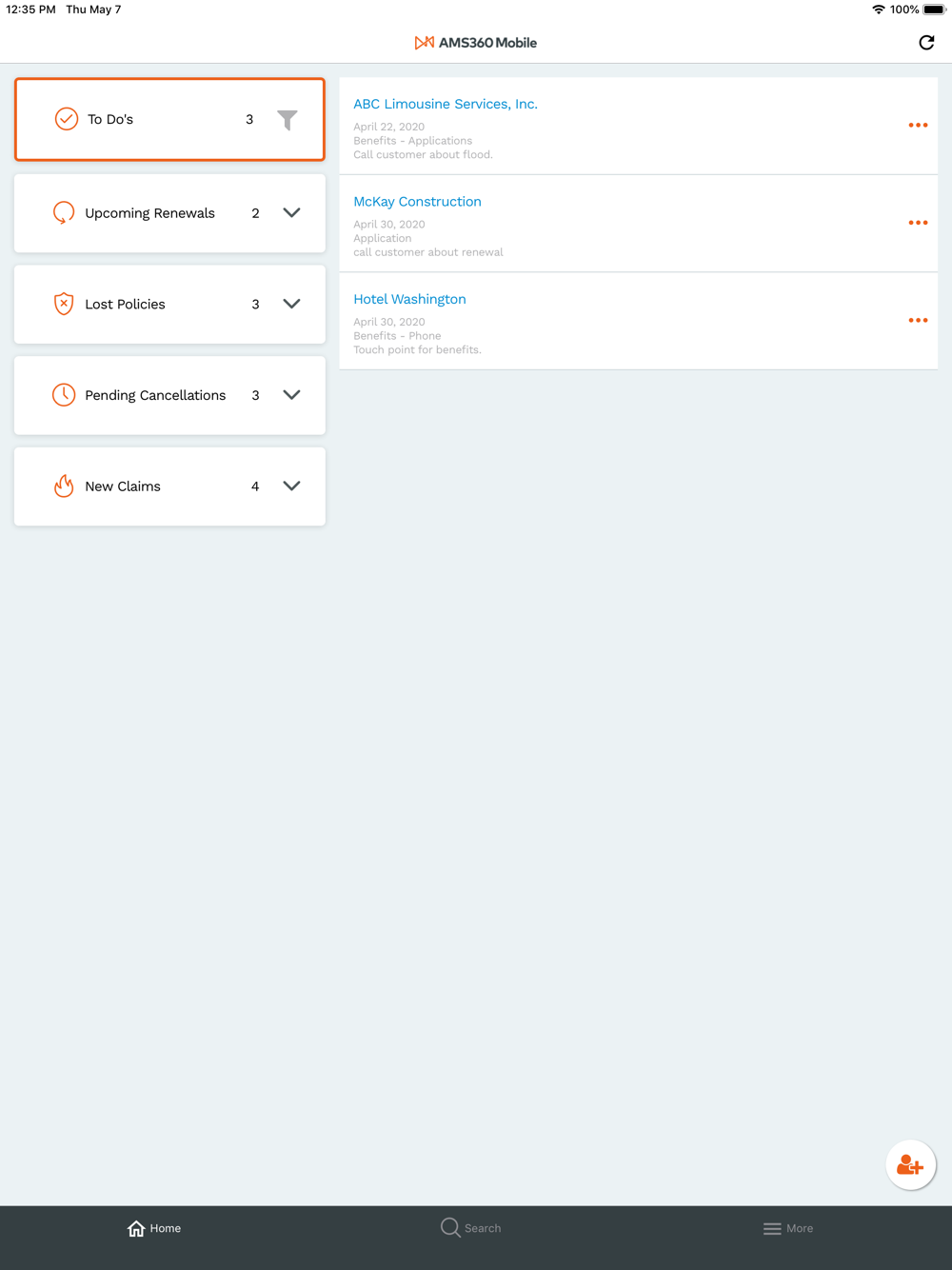 Making use of an intuitive user interface, AMS360 Mobile allows you to view client and contact details, policy information including declaration page views, recent claims summaries, upcoming renewals, download documents, notes, activities and suspenses. If you have add/edit rights, you can fully service your customers and immediately update your management system when you edit existing client and contact records, create new clients and add new activities and suspenses.