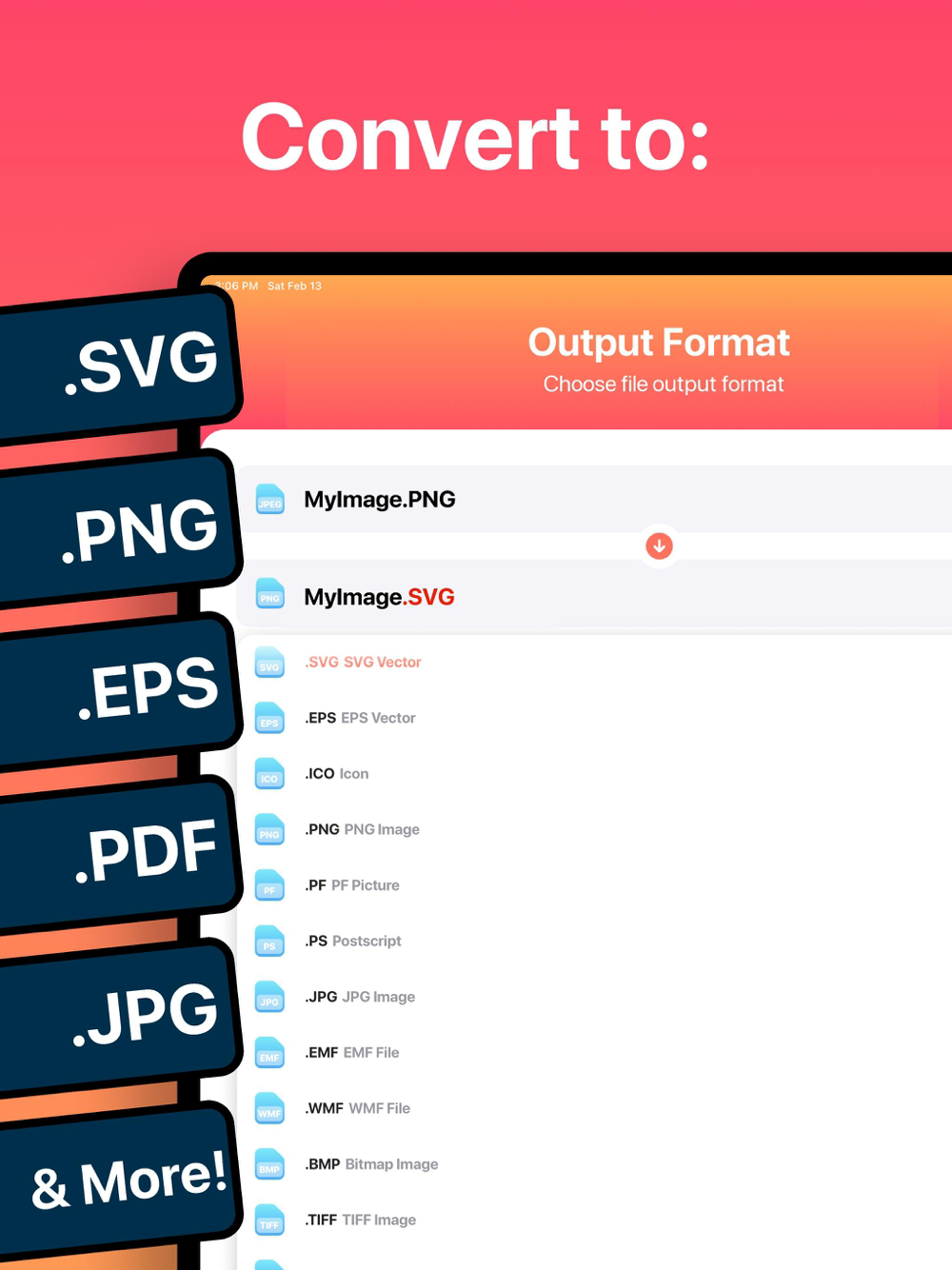 SVG, EPS, ICO, PNG, PS, JPG, BMP, TIFF, WEBP, DXF, PSD, PDF