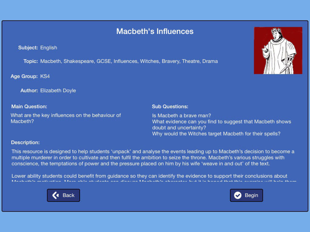 This is a unique app in allowing pairs to work simultaneously on one iPad with a task designed to encourage discussion around the main question ‘What are the key influences on the behaviour of Macbeth?’