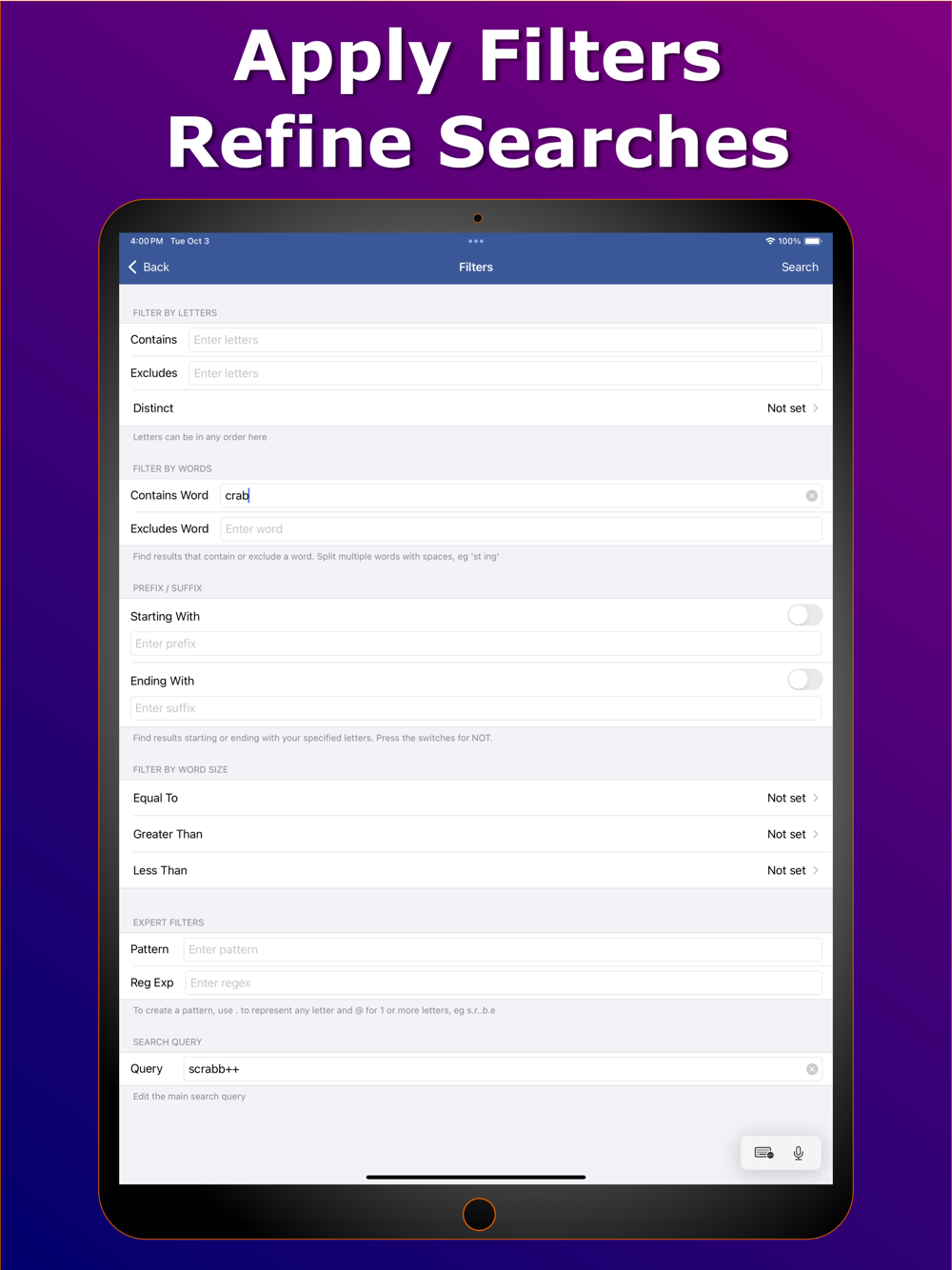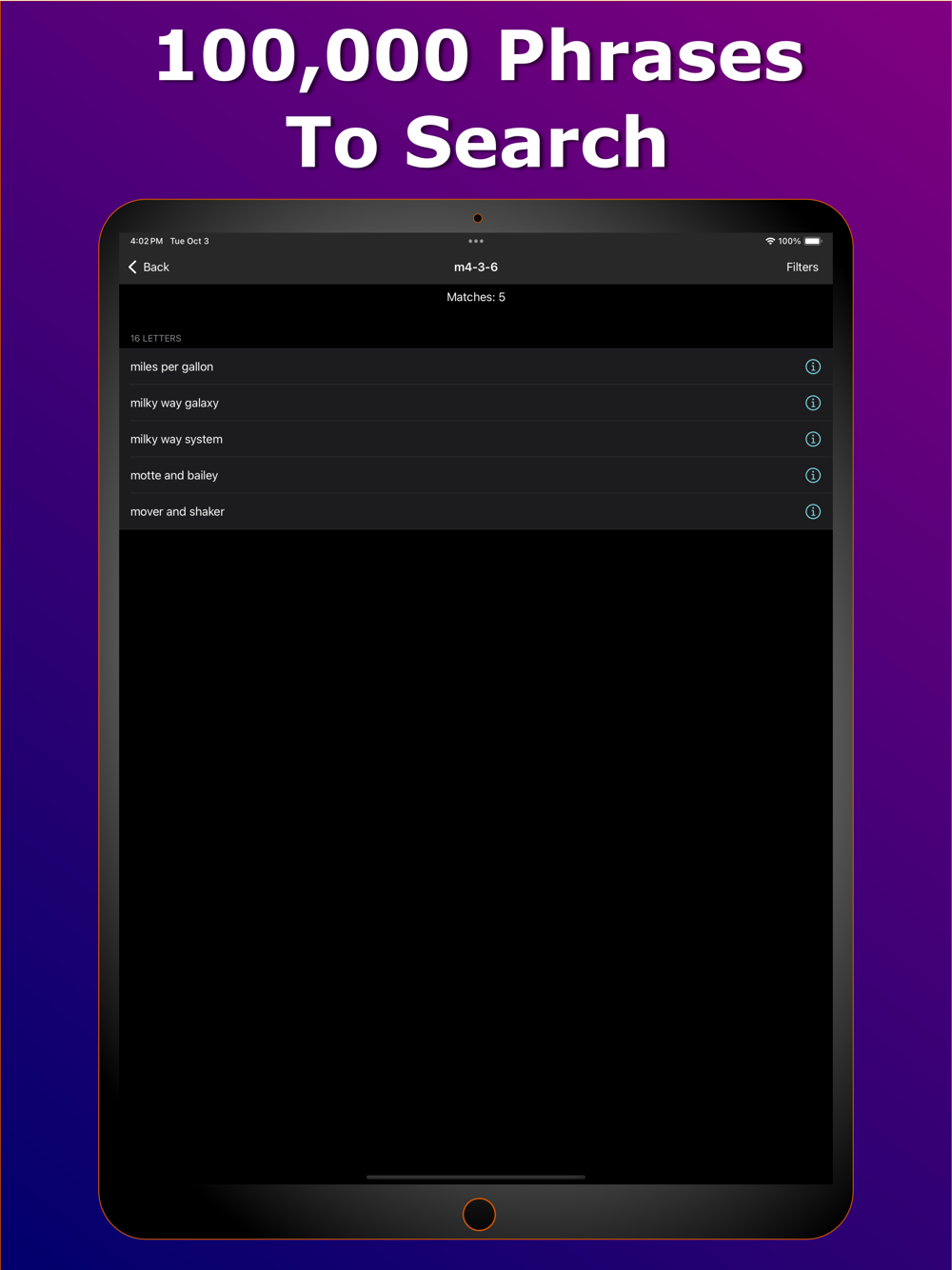*New filters, NOT Starts With and NOT Ends With, there are now toggle switches on the prefix/suffix filters to enable NOT.*Improved accessibility features, text within the app will now resize accordingly with the system Text Size setting.*New setting, you can now choose large or small results font.