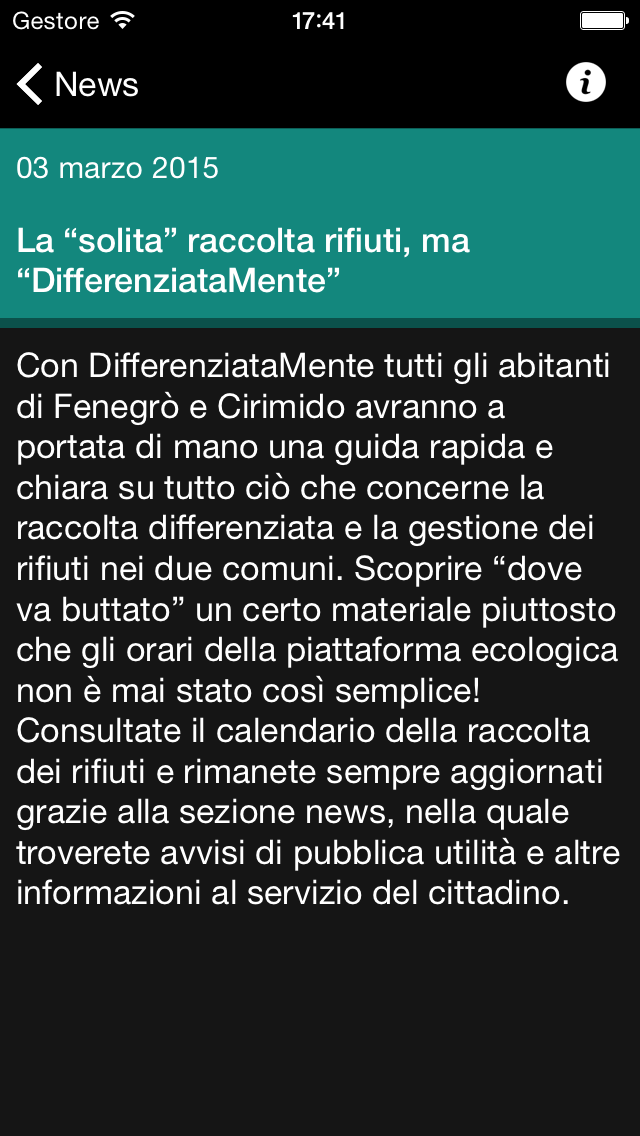Con DifferenziataMente avrai a portata di mano una guida rapida e chiara su tutto ciò che concerne la raccolta differenziata e la gestione dei rifiuti nei due comuni di Fenegrò e Cirimido. Scoprire “dove va buttato” un certo materiale piuttosto che gli orari della piattaforma ecologica non è mai stato così semplice! Consultate il calendario della raccolta dei rifiuti e rimanete sempre aggiornati grazie alla sezione news, nella quale troverete avvisi di pubblica utilità e altre informazioni al servizio del cittadino.