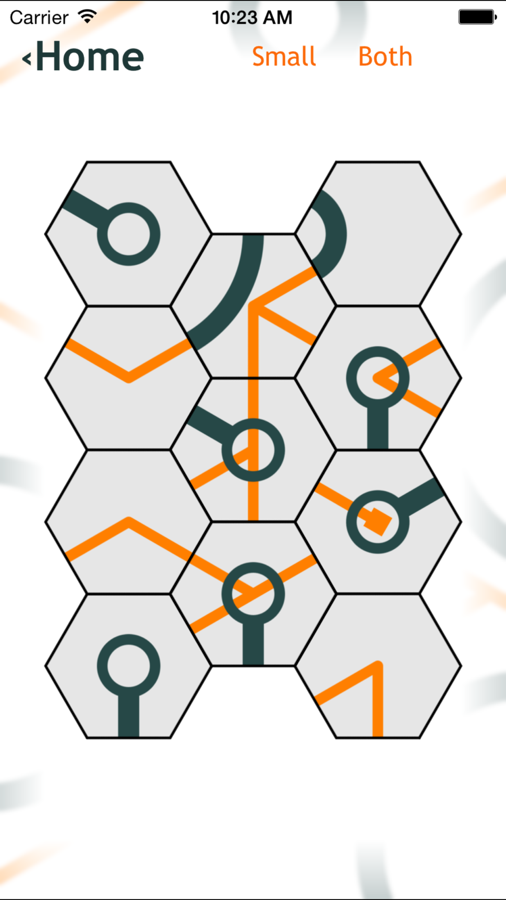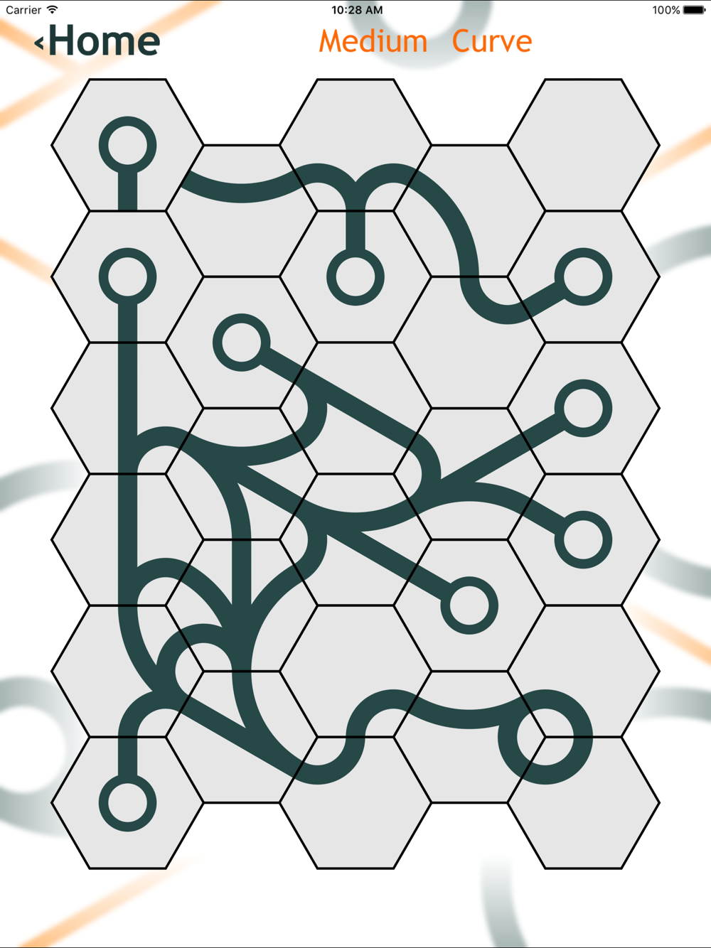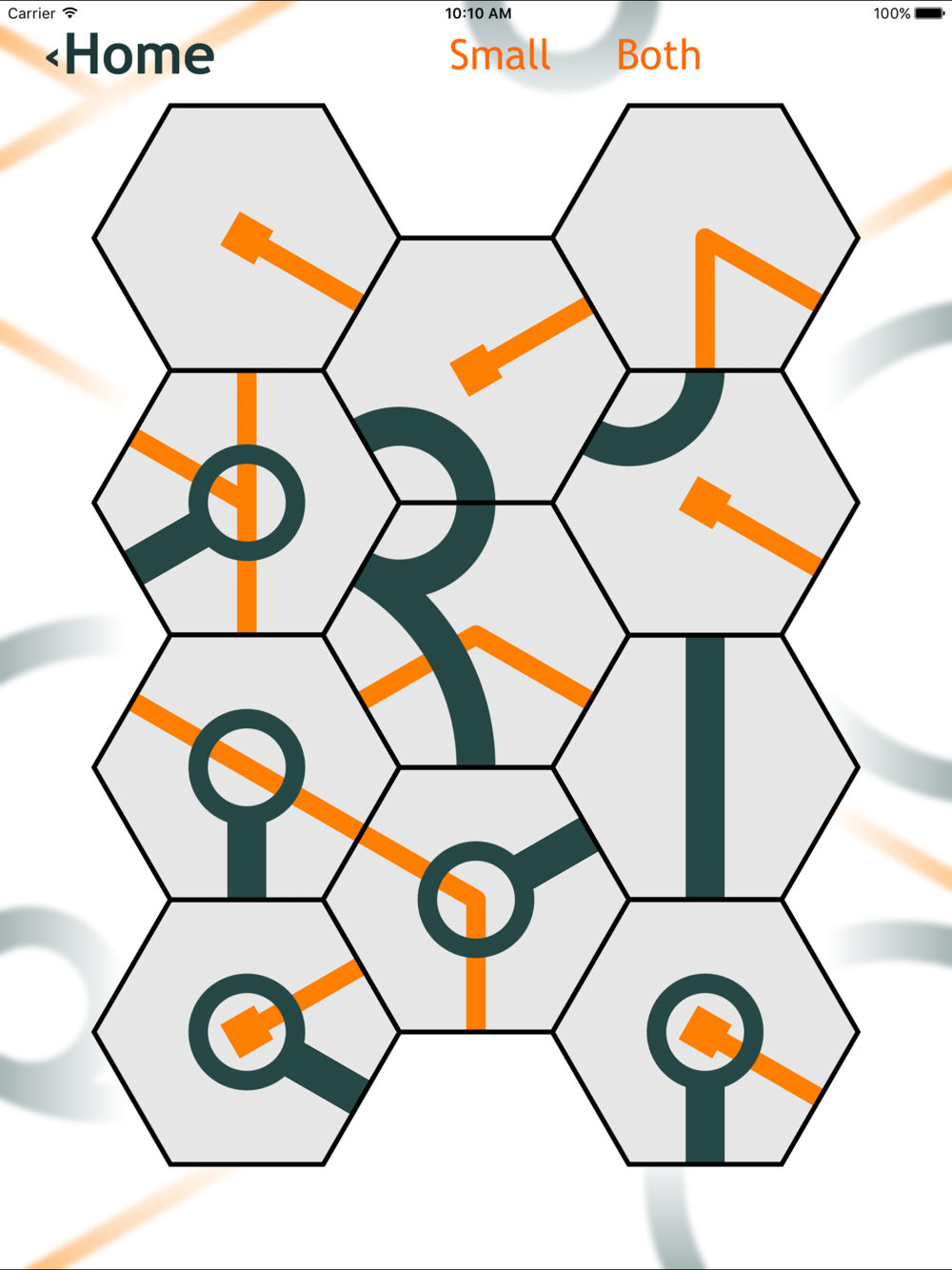 Tap the Hexagons to rotate them into the right position. Complete the puzzle when all the Curved and/or straight lines are connected. See how many puzzles you can solve!