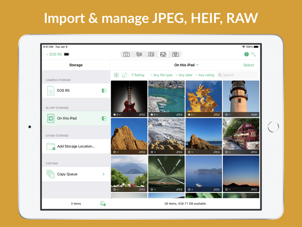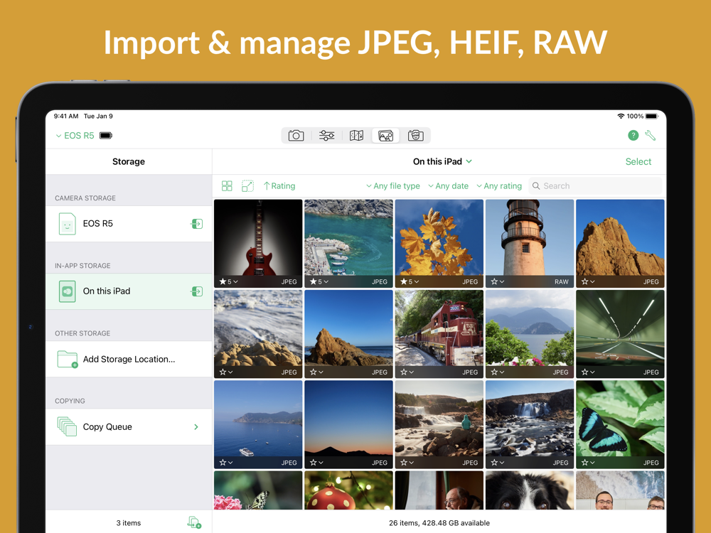 - Fast and easy downloading of full resolution images (including RAW**) directly to your iPhone or iPad.