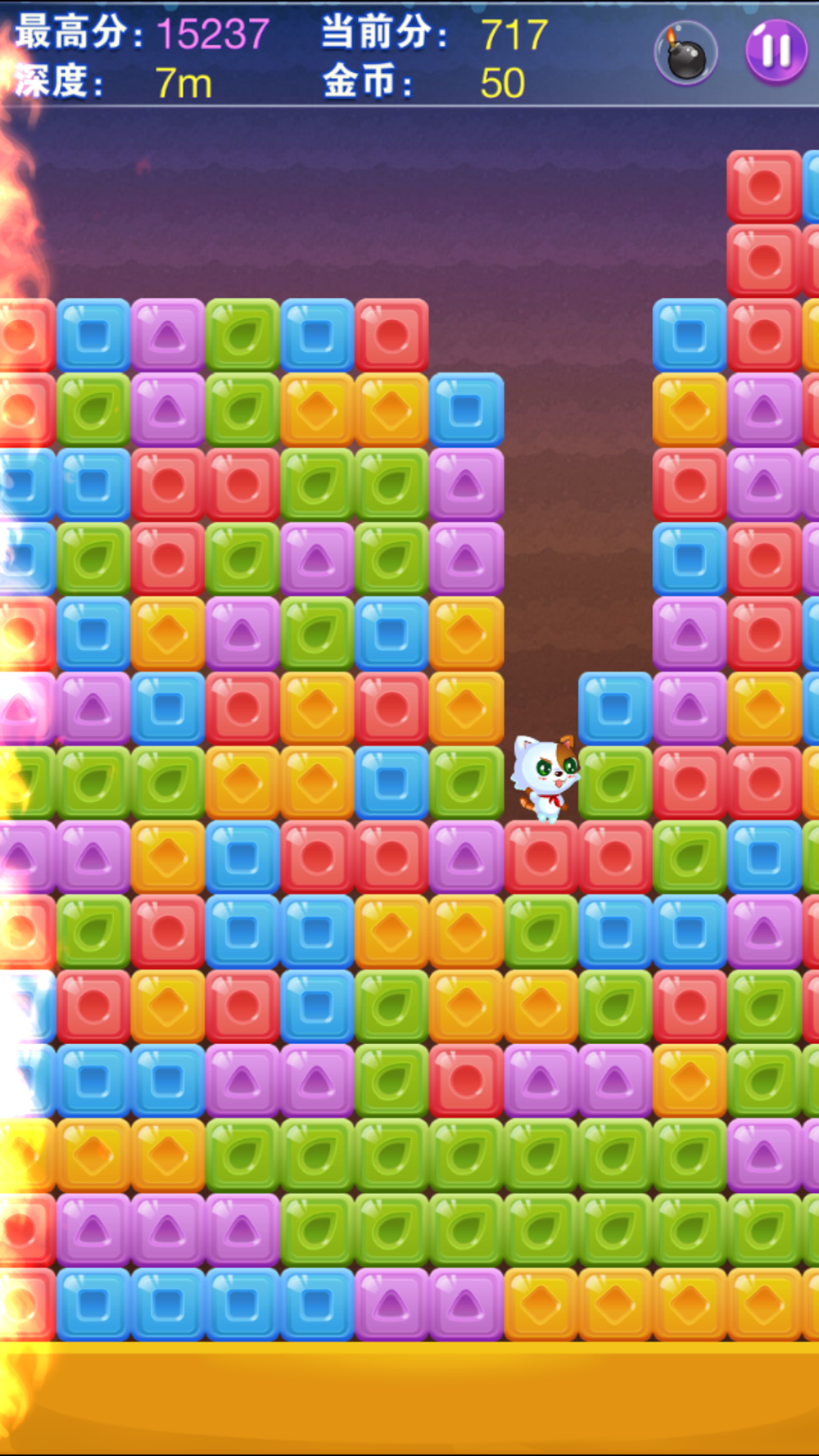 Kitty will keep moving as long as there's no brick blocks the way,so try to destory as many bricks as you can to help kitty go further and deeper. At least three bricks with same color can be tapped to destory.
