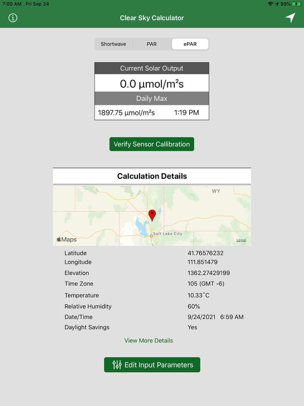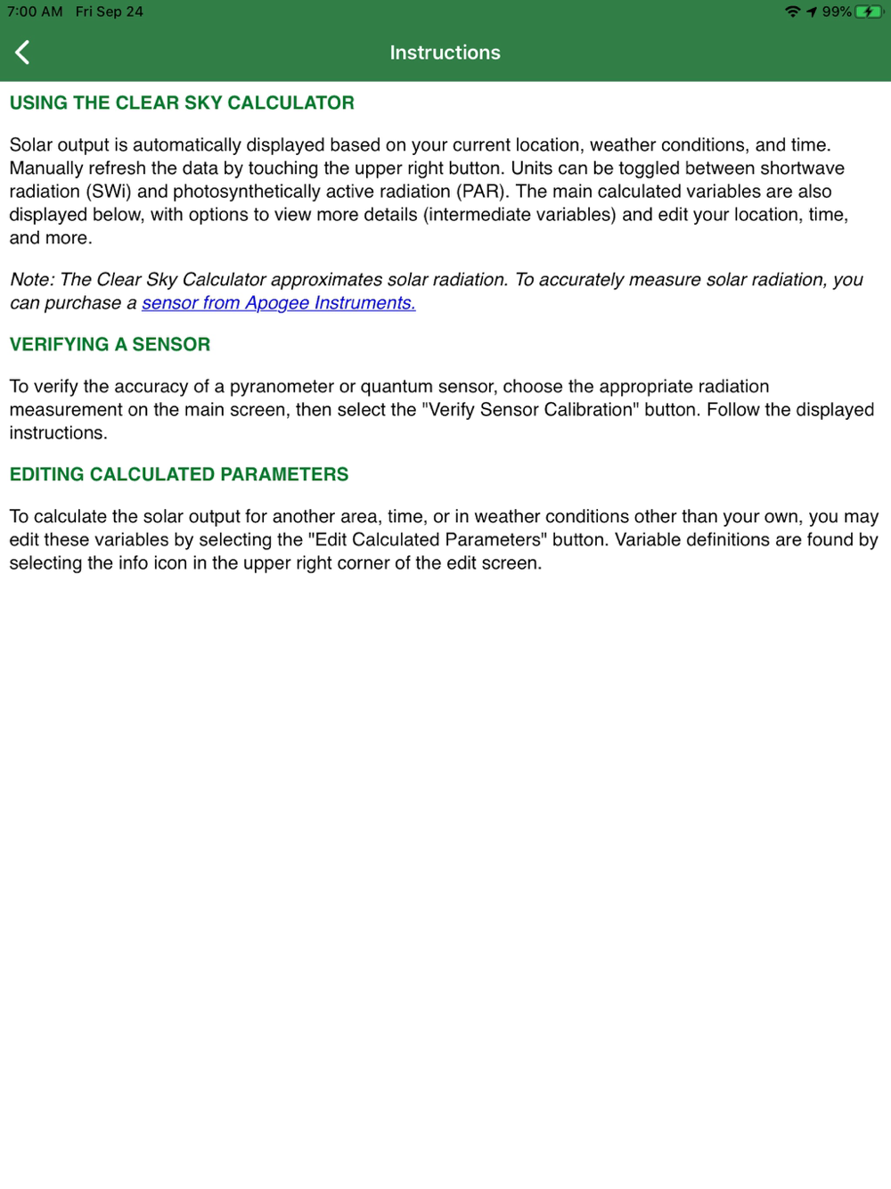 Apogee strongly encourages our customers to use the Clear Sky Calculator as an effective way to monitor pyranometer and quantum sensor performance and determine the need for sensor recalibration. If a sensor is consistently different from the Clear Sky Calculator by more than a few percent, please contact us about recalibration.