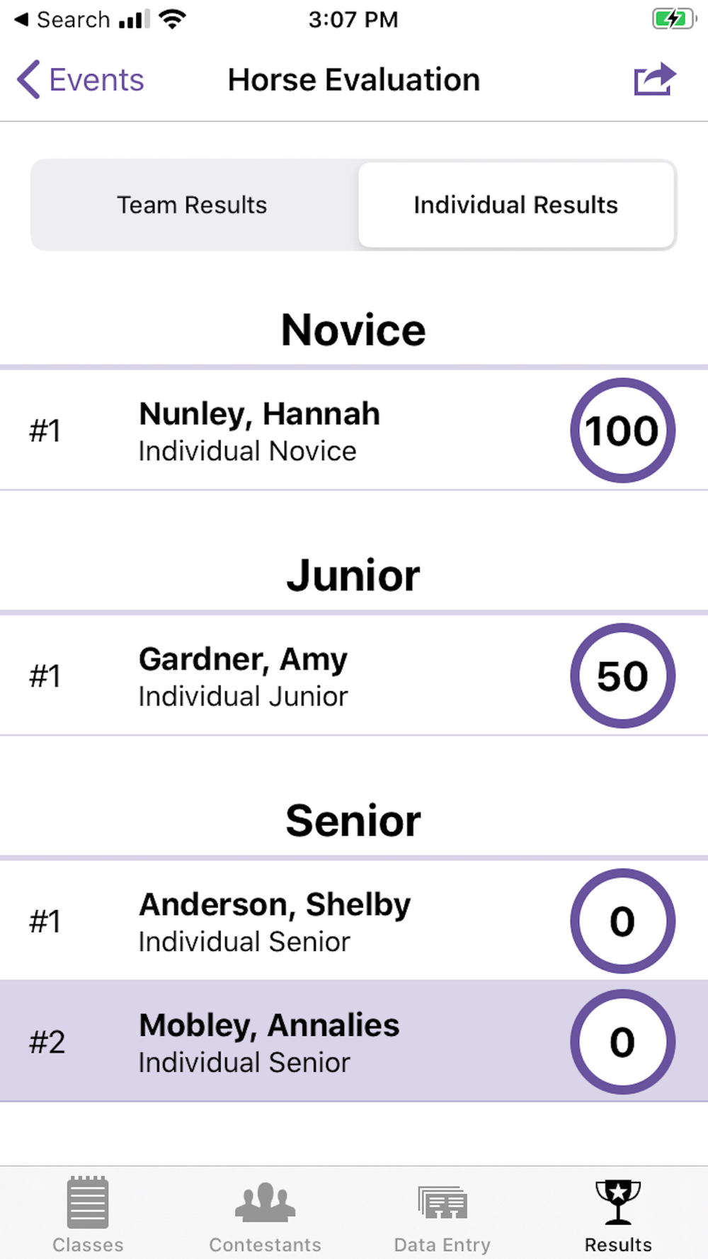 eJudging Pro is a contest management tool suited for livestock, horse, and/or consumer-decision-making contests that utilize a Hormel card placing system. Enter the Judge's Placing and Class Cuts, and eJudging Pro will calculate individual and team scores for classes, age groups, teams and individuals. The app is ideal for practice sessions to track individual performance and also has a stand-alone Hormel card calculator that can be used without tracking individuals.