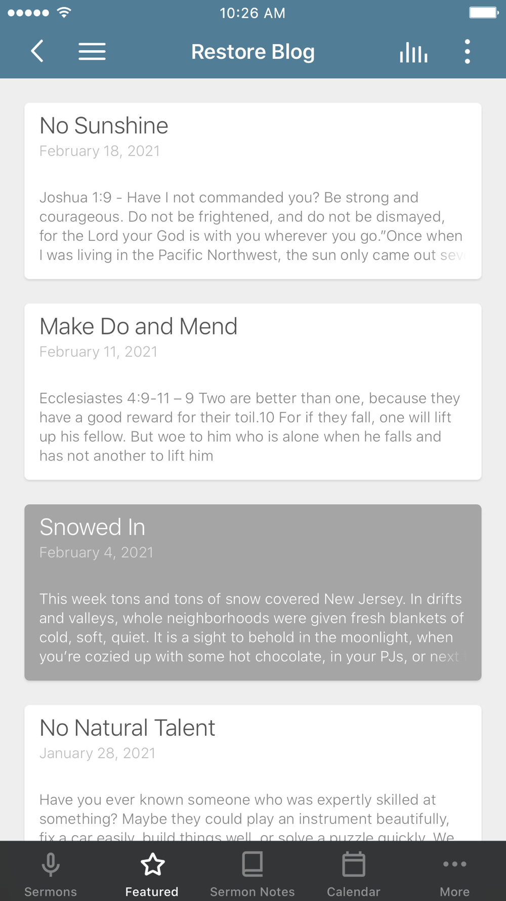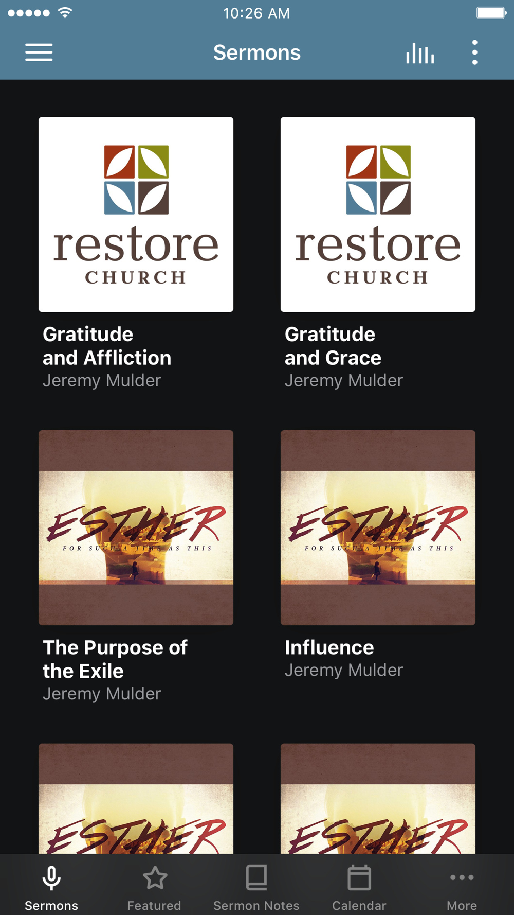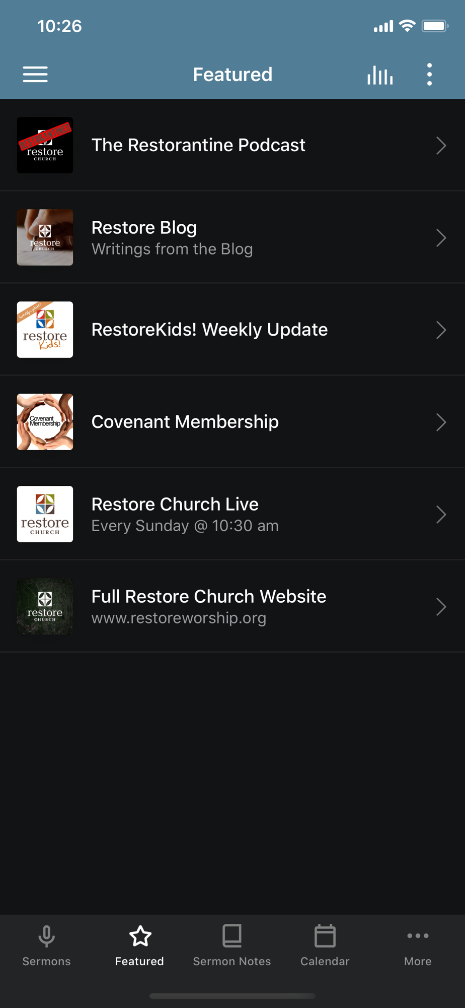 This is your one stop shop for all of Restore's content, including music, sermons, blog posts, and more. Get push notifications of important messages from Restore. Share your favorite media on Twitter or Facebook, or email it to your Grandma. Listen or watch on wi-fi or 4G/LTE.