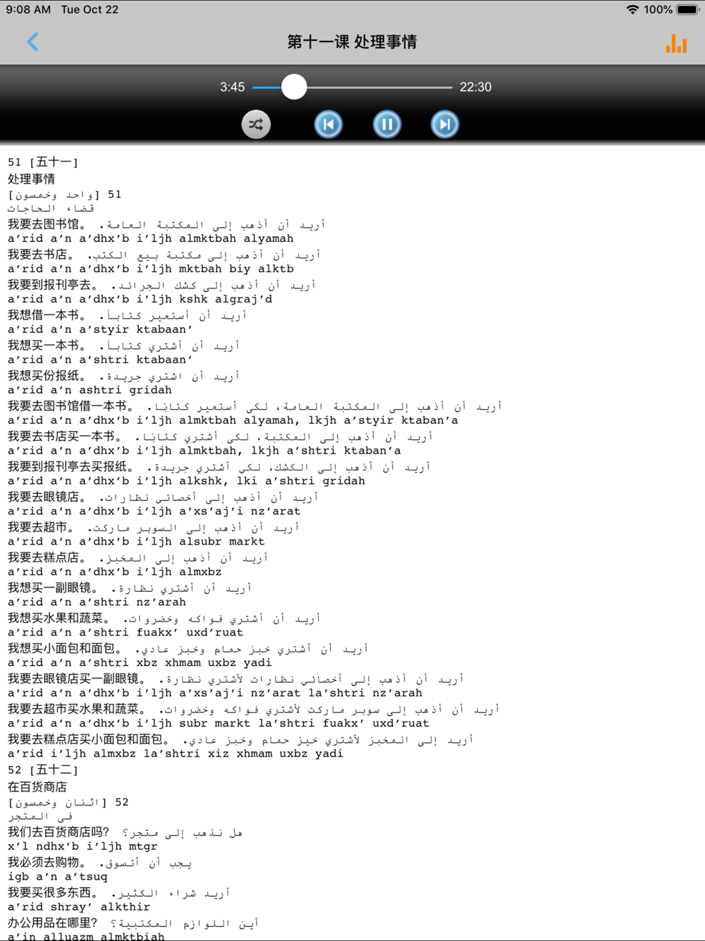 本应用满足了初学者的所有要求。不仅软件设计大方美观,内容更是丰富多彩。从基础入门,到日常生活、青春校园、职场风云、特色文化等,几乎涵盖了所有你能想到的,以及你若是有机会去阿拉伯国家旅游生活或是工作能够用到的所有方面。
