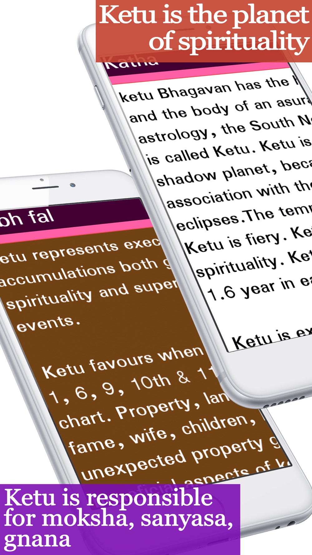 This application gives a complete information of the different pujas/ remedies to reduce the ill effects of Ketu. Information about fasting, the process of worship/ doing puja, Mantras and its details, the count of its chanting and its benefits are a few to be named.