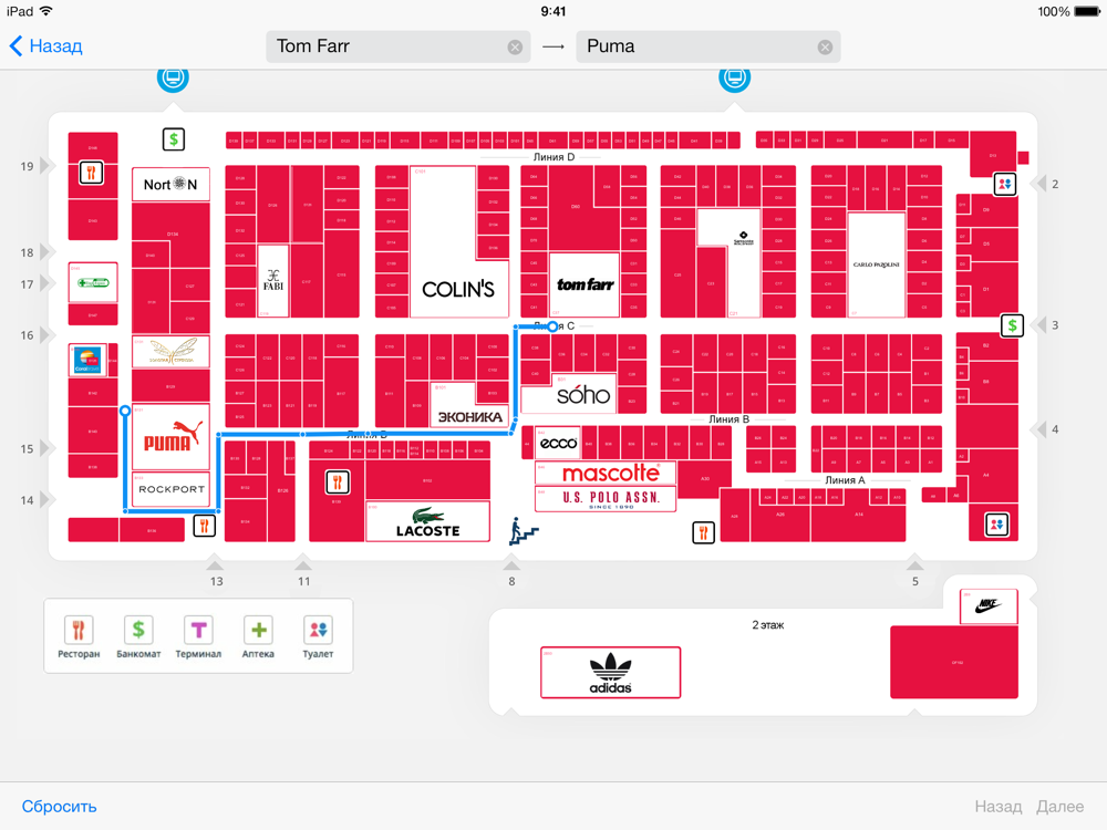 Благодаря этому приложении вы не заблудитесь в торговом центре «Савеловский» и легко найдете дорогу к нужному вам магазину. Откройте карту центра и, тапнув на экран, укажите, где вы находитесь и куда хотите пойти. Либо задайте пункты А и В, указав номера павильонов.