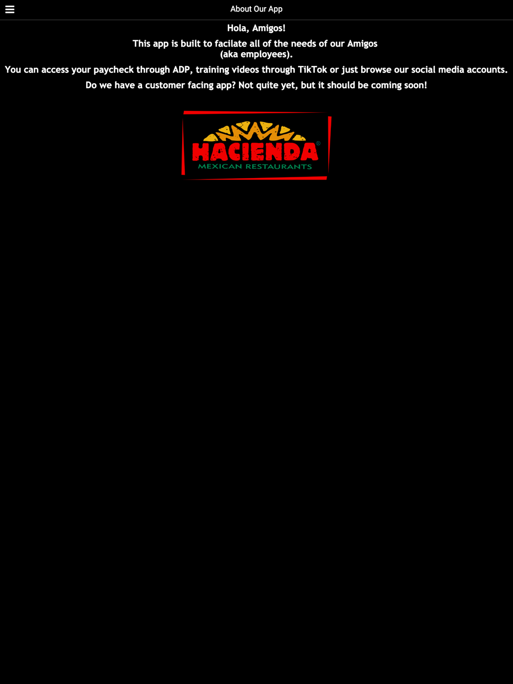 Hacienda has created this App with our Amigos in mind. Once you are hired at one of our locations throughout the state of Indiana, this App will bring everything together for your ease. No wondering where you need to go to look for all of your important employment information. No wondering what is going on socially and operationally at Hacienda. This App brings all of that to your fingertips!