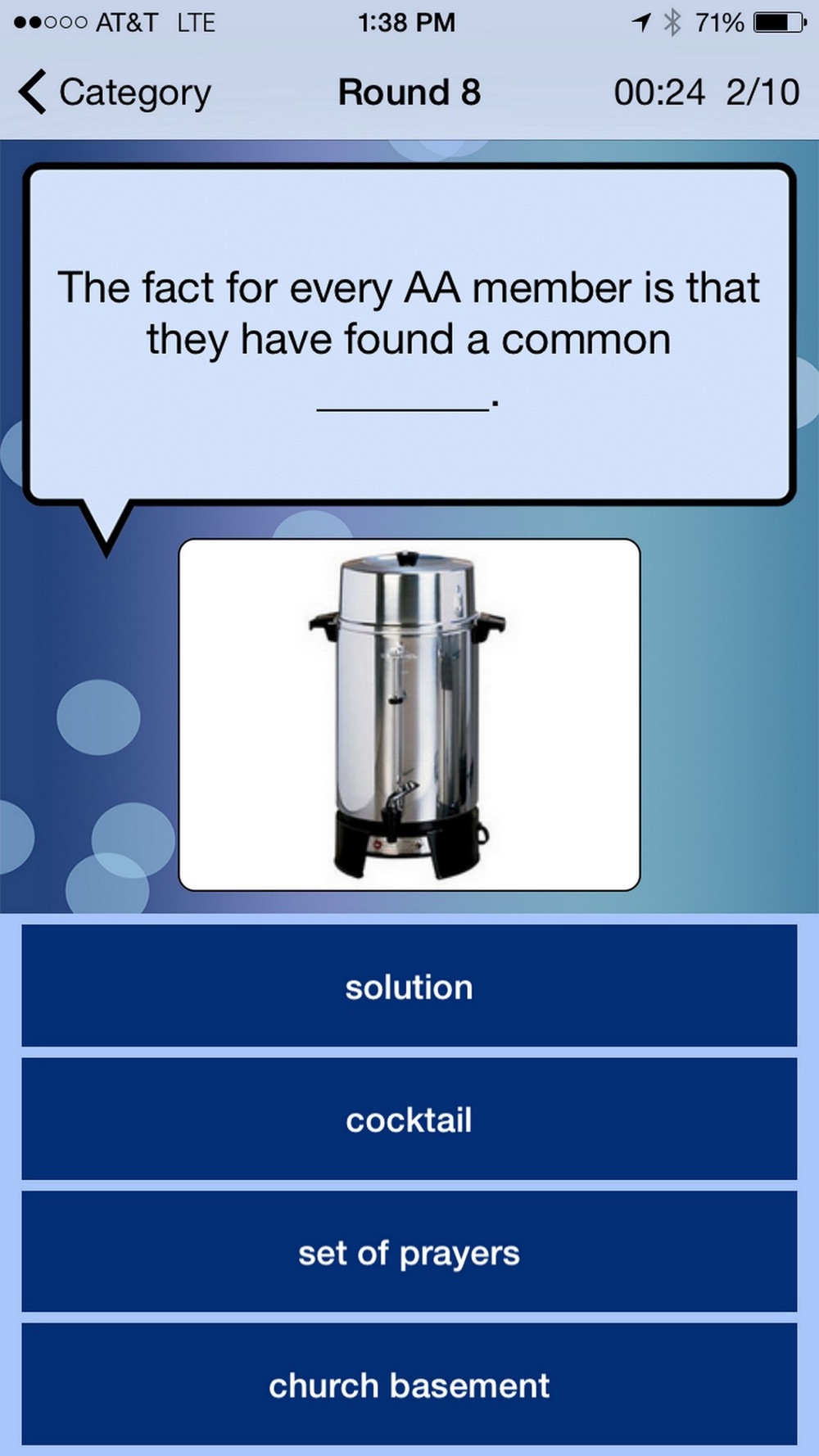 This app is made for those members who have some sobriety time and who agree with Bill’s statement “we aren’t a glum lot”. The goal of the game is to have some sober fun while learning about the program that is helping to save your life. Be prepared to be totally humbled by your ignorance of the Big Book, AA History, AA Slogans, and Big Book Vocabulary!