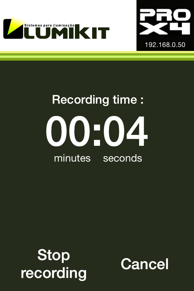 Controle remoto para interface Lumikit PRO X4. Clique sobre o ícone "PRO X4" para ver a lista de interfaces na rede. Permite troca de programas, iniciar gravação, apagar programas que foram gravados anteriormente. A interface deve estar conectada no mesmo roteador Wi-Fi que o iPhone/iPad para correto funcionamento. Envia pacotes UDP sobre a rede.